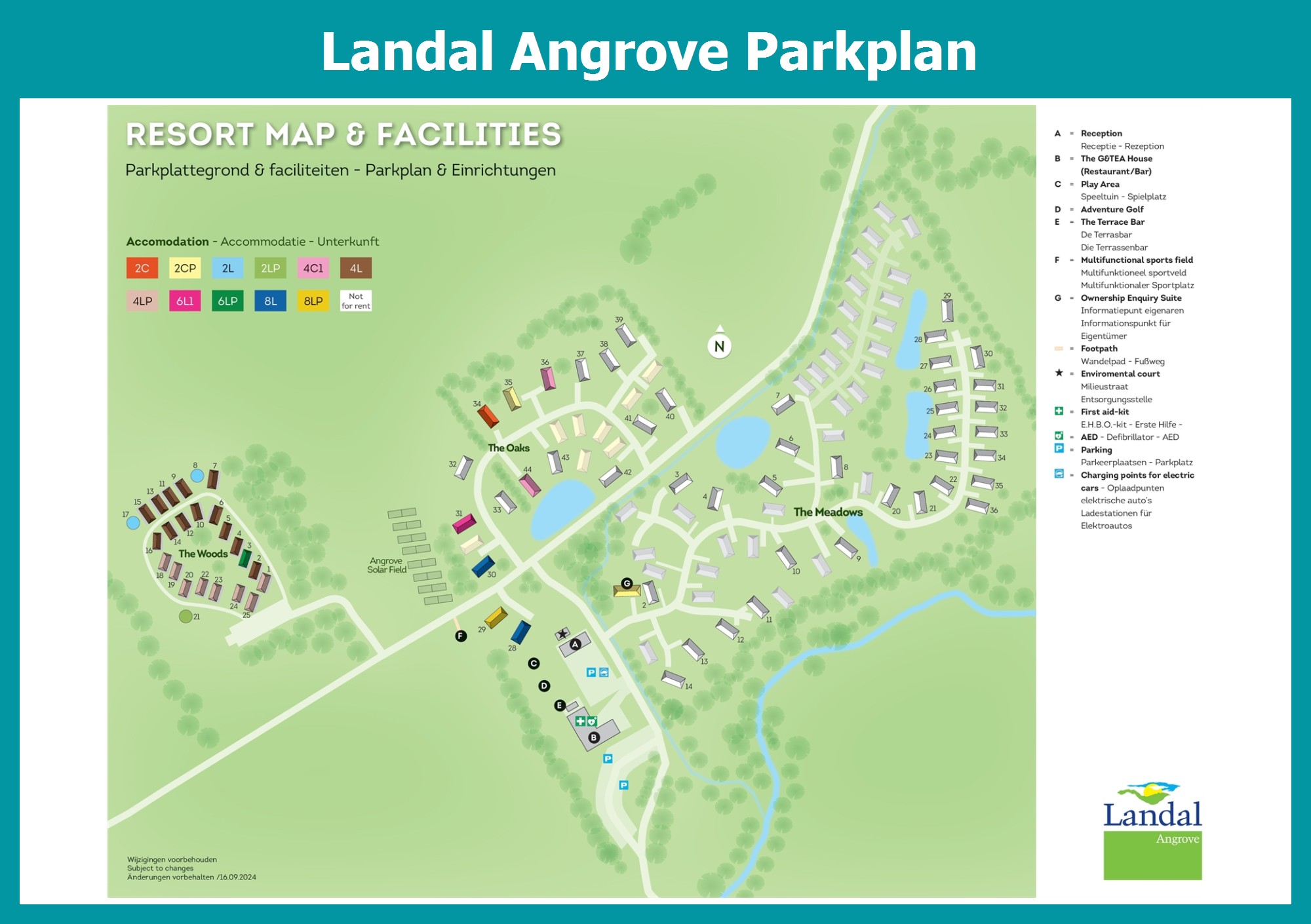 Aktueller und übersichtlicher Parkplan von Landal Angrove mit alle Unterkünfte und Einrichtungen, auch als PDF herunterladbar.