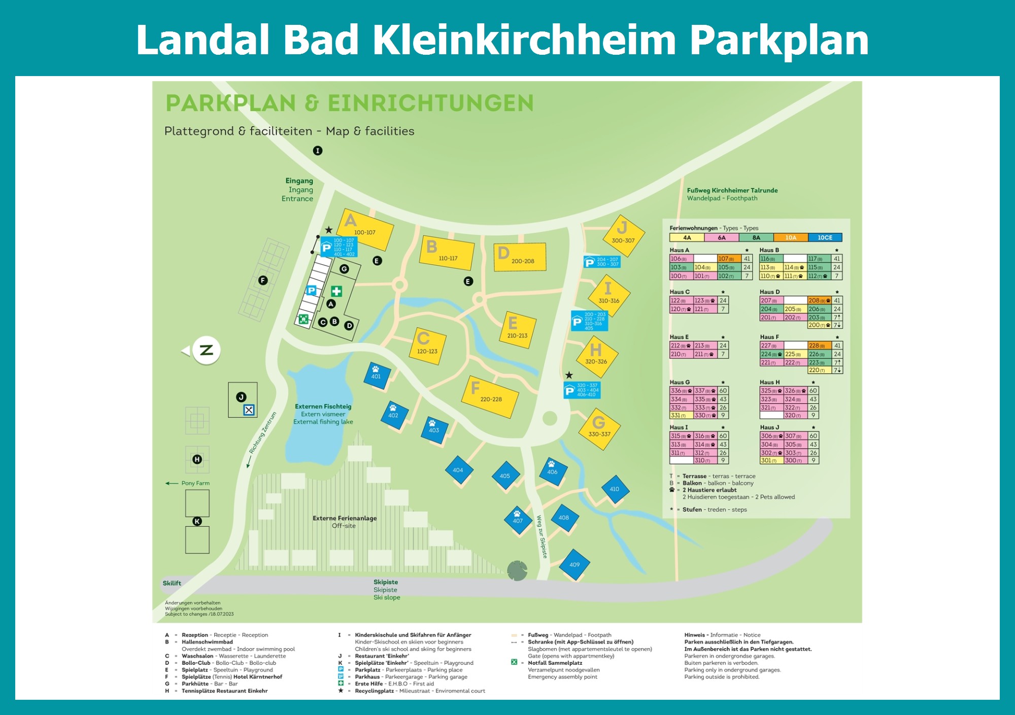 Aktueller und übersichtlicher Parkplan von Landal Bad Kleinkirchheim mit alle Unterkünfte und Einrichtungen, auch als PDF herunterladbar.