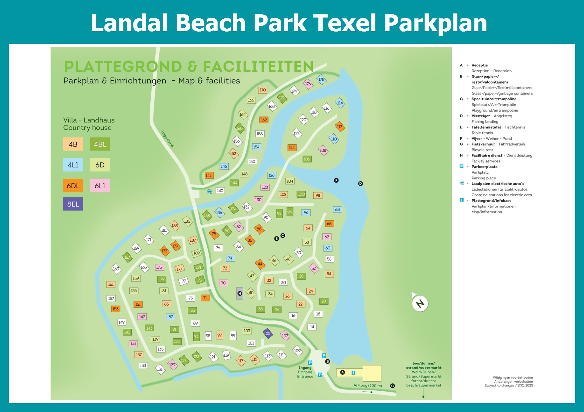 Aktueller und übersichtlicher Parkplan von Landal Beach Park Texel mit alle Unterkünfte und Einrichtungen, auch als PDF herunterladbar.