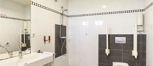 Angepasstes Badezimmer mit Badewanne, Dusche mit Bügeln, festem Duschsitz, unterfahrbarem Waschbecken (mindestens 78 cm), verstellbarem oder langem Spiegel und einem Rollstuhlwendekreis von mindestens 150 cm und feste Hebeeinrichtung