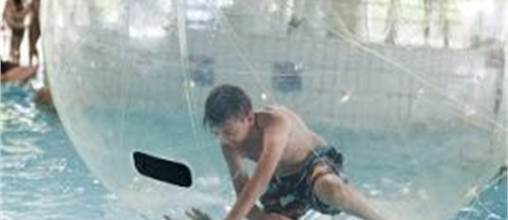 Kriecht in die lebensgroße Luftblase und lauf über das Wasser. Kannst du es ohne zu fallen?