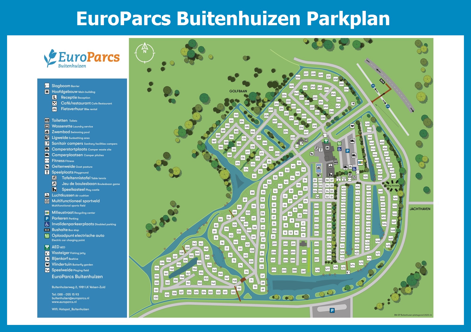 Aktueller und übersichtlicher Parkplan von EuroParcs Buitenhuizen mit alle Unterkünfte und Einrichtungen, auch als PDF herunterladbar.