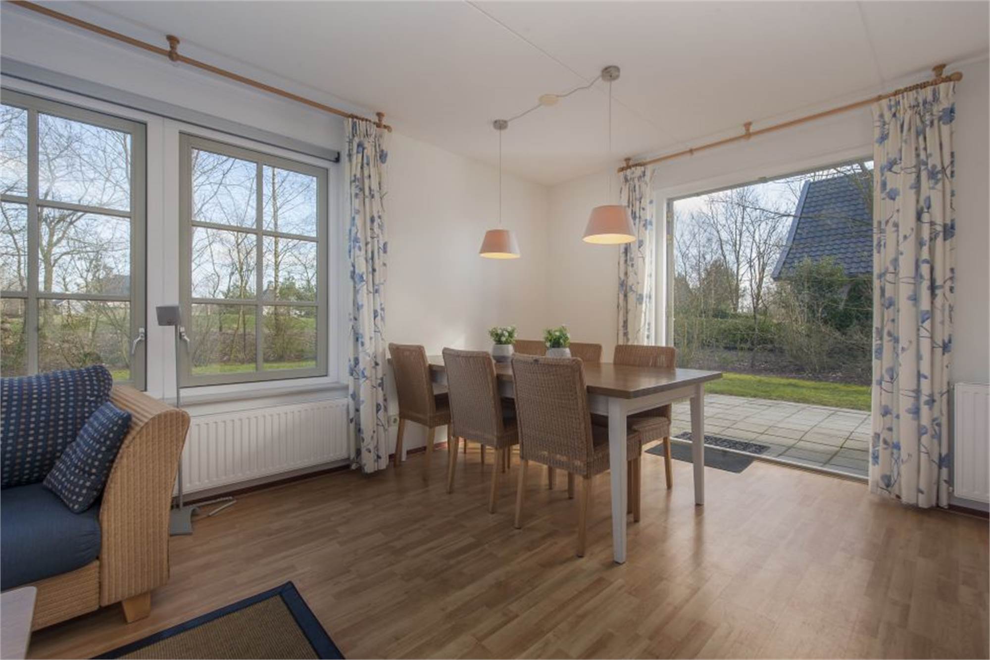 Erdgeschoss: Eingang mit Flur und Toilette. Wohnzimmer mit Sitz- und Essecke, offene Küche und aufschlagende Türen zur Terrasse mit Gartenmöbeln. Ein Schlafzimmer mit zwei Einzelbetten. Badezimmer mit Waschtisch, Dusche und Badewanne.