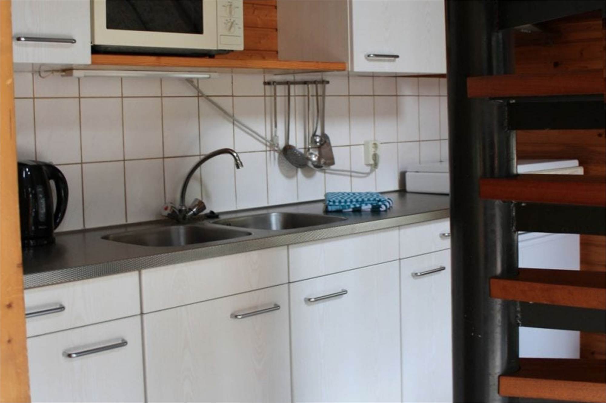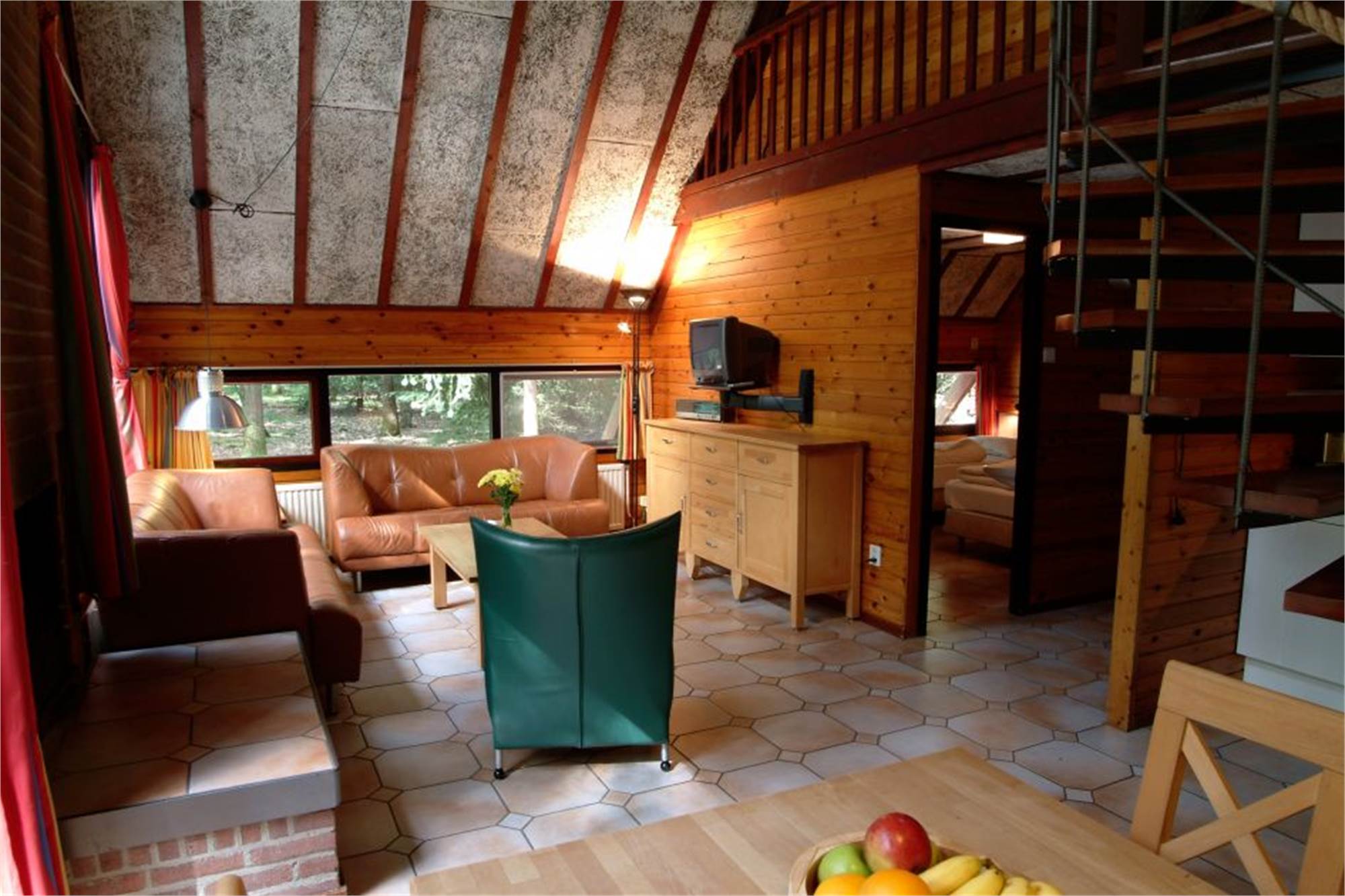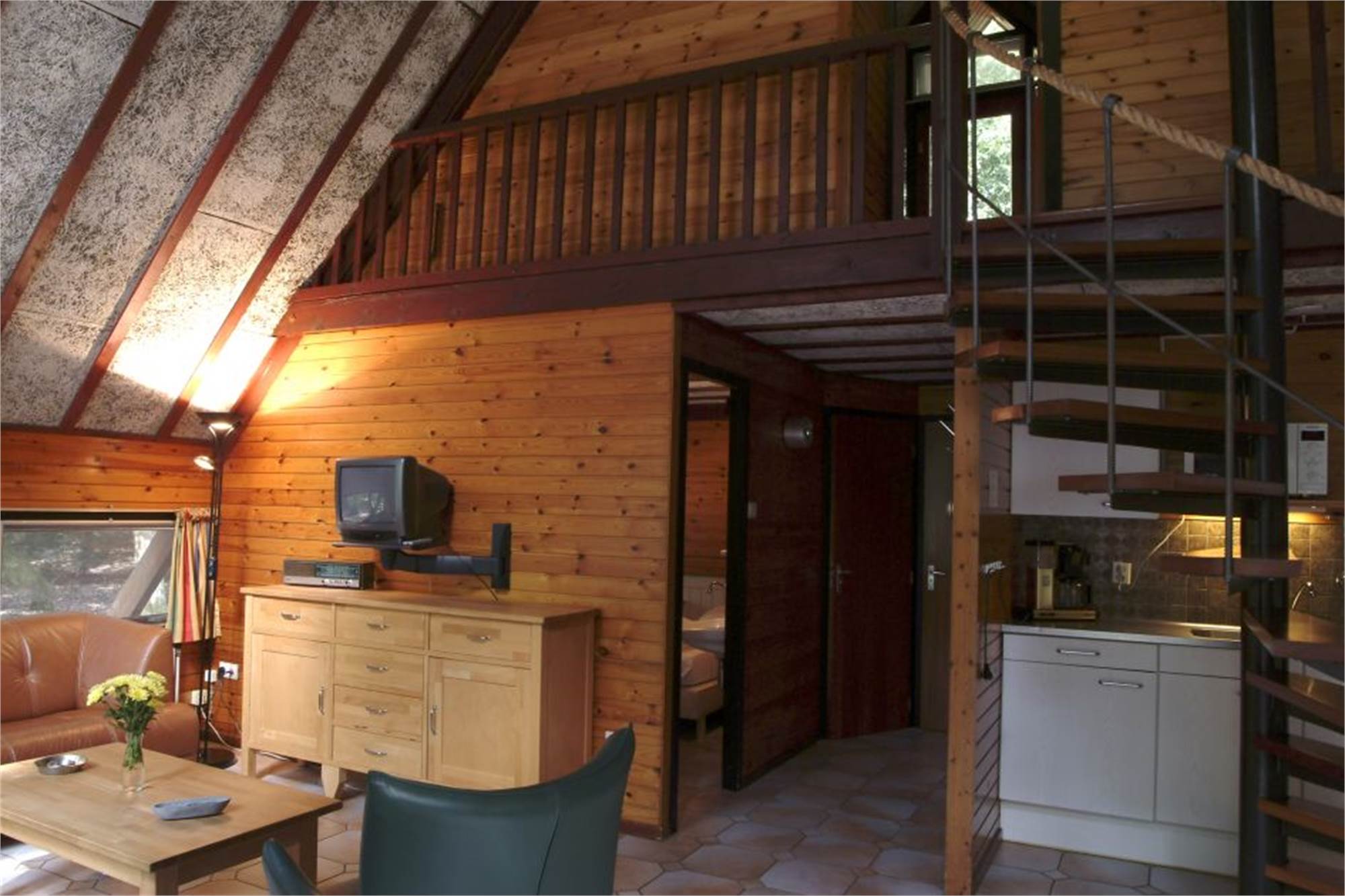 Einteilung: Wohnzimmer mit offenem Kamin und Flatscreen-TV. Küche mit Kühlschrank mit Gefrierfach, Kaffeemaschine und Mikrowelle. Zwei Schlafzimmer mit zwei Einzelbetten. Badezimmer mit Fußbodenheizung und Toilette. Ladestation für Elektro-Fahrräder. Terrasse mit offenem Kamin und Lage am Waldrand.