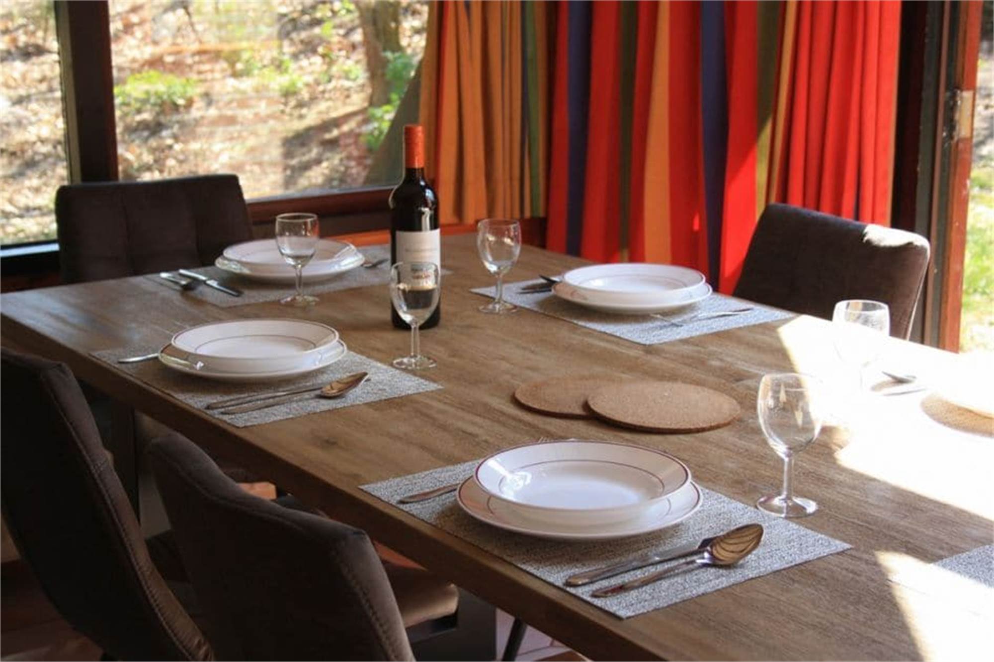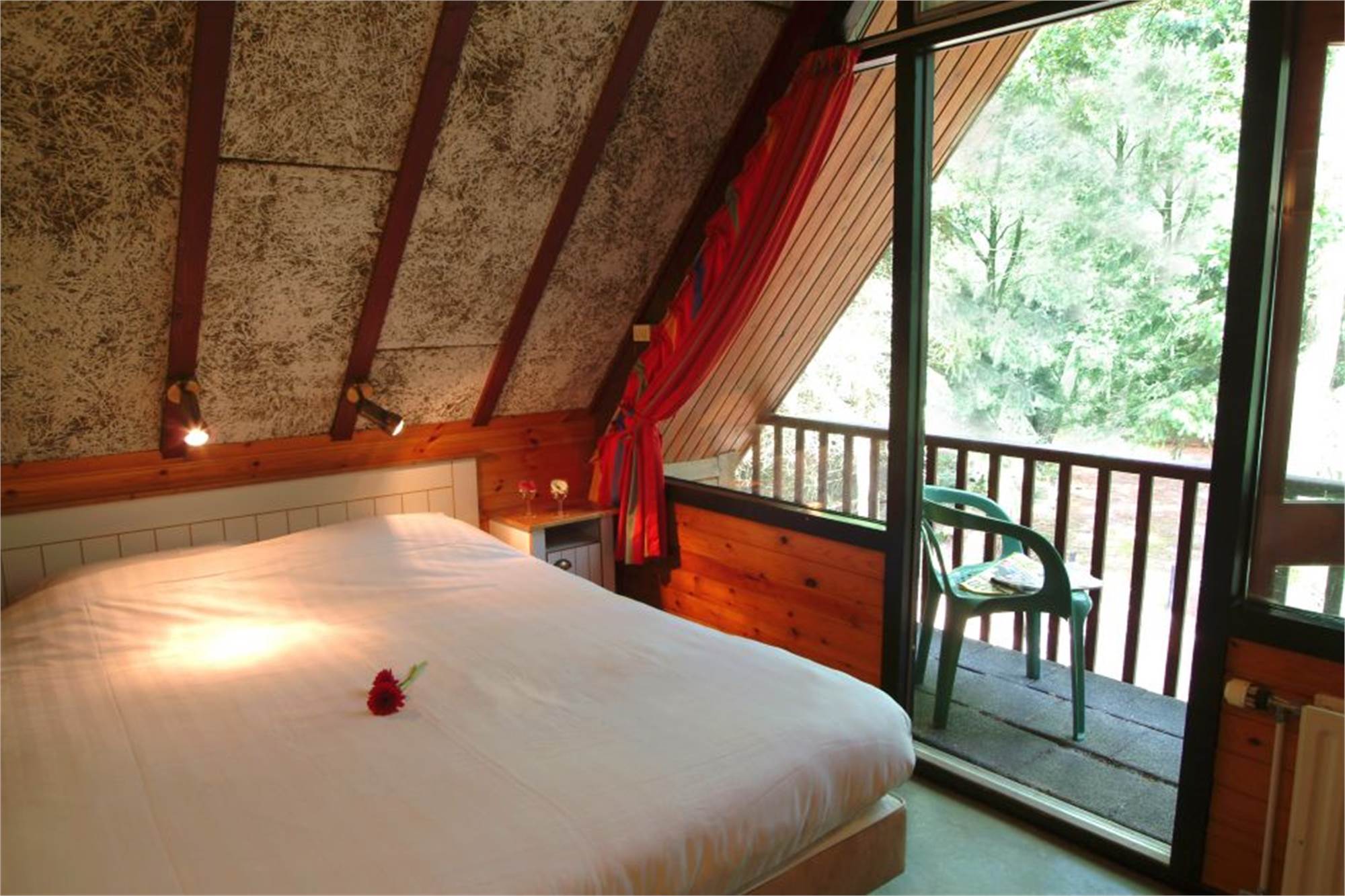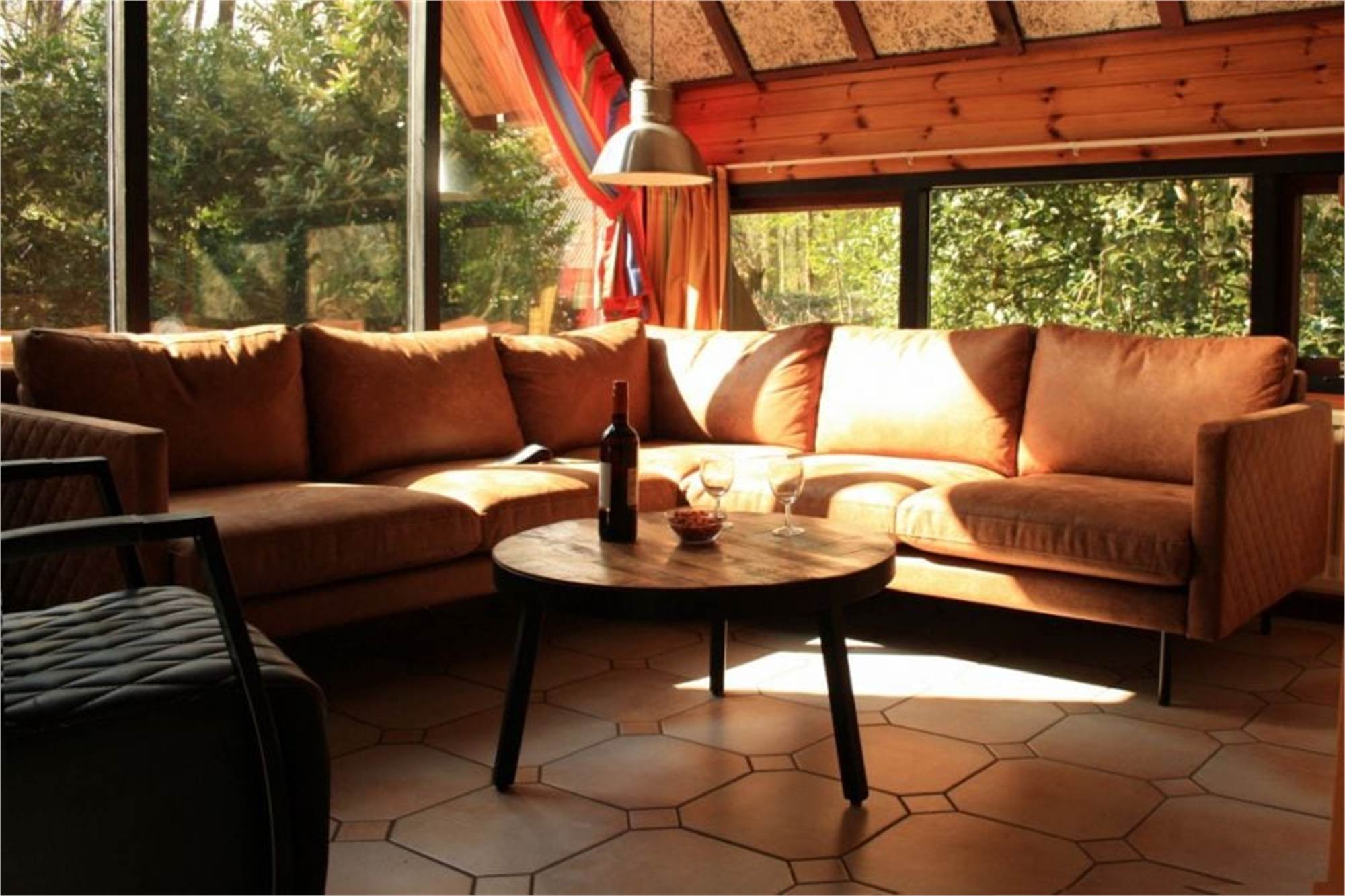 Einteilung: Wohnzimmer mit offenem Kamin und Flatscreen-TV. Küche mit Kühlschrank mit Gefrierfach, Kaffeemaschine und Mikrowelle. Zwei Schlafzimmer mit zwei Einzelbetten. Badezimmer mit Fußbodenheizung und Toilette. Ladestation für Elektro-Fahrräder. Terrasse mit offenem Kamin und Lage am Waldrand.