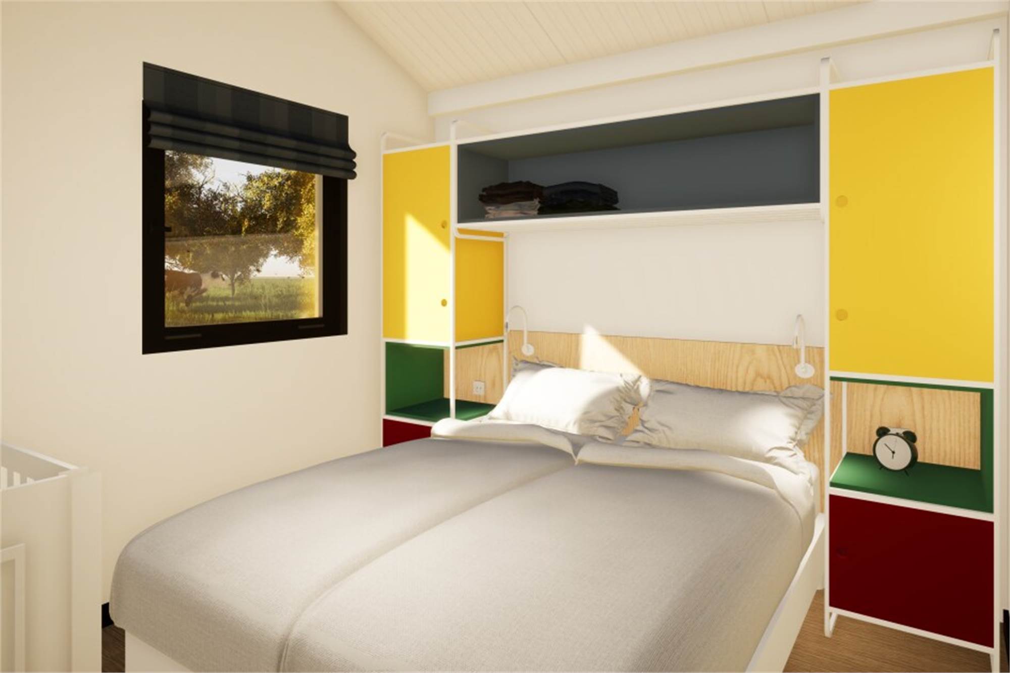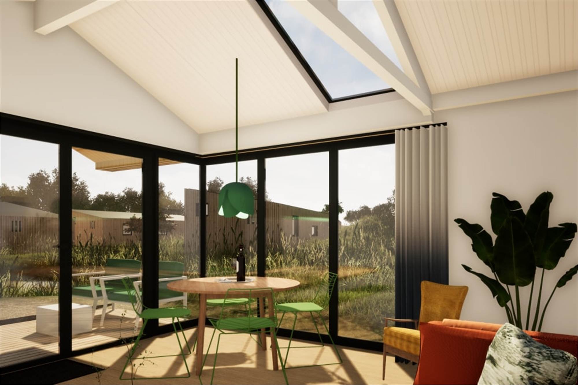 Diese freistehende Lodge ist für 4 Personen geeignet. Im Wohnzimmer befindet sich eine Sitzecke, eine Essecke und ein Smart-TV. Die Küche ist mit einem Geschirrspüler, Kühlschrank mit Gefrierfach, einer Mikrowelle, Kaffeemaschine und Wasserkocher ausgestattet. Es sind 2 Schlafzimmer mit jeweils 2 Einzelbetten vorhanden. Im Schlafzimmer ist Platz für ein extra Kinderbett. Das Badezimmer verfügt über eine Waschbecken und eine begehbare Dusche. Es ist ein separates WC vorhanden. Die Lodge verfügt über einen Garten mit einer Veranda und einem Loungeset. Die gesamte Lodge ist mit Fußbodenheizung versehen und verfügt über kostenloses WiFi.