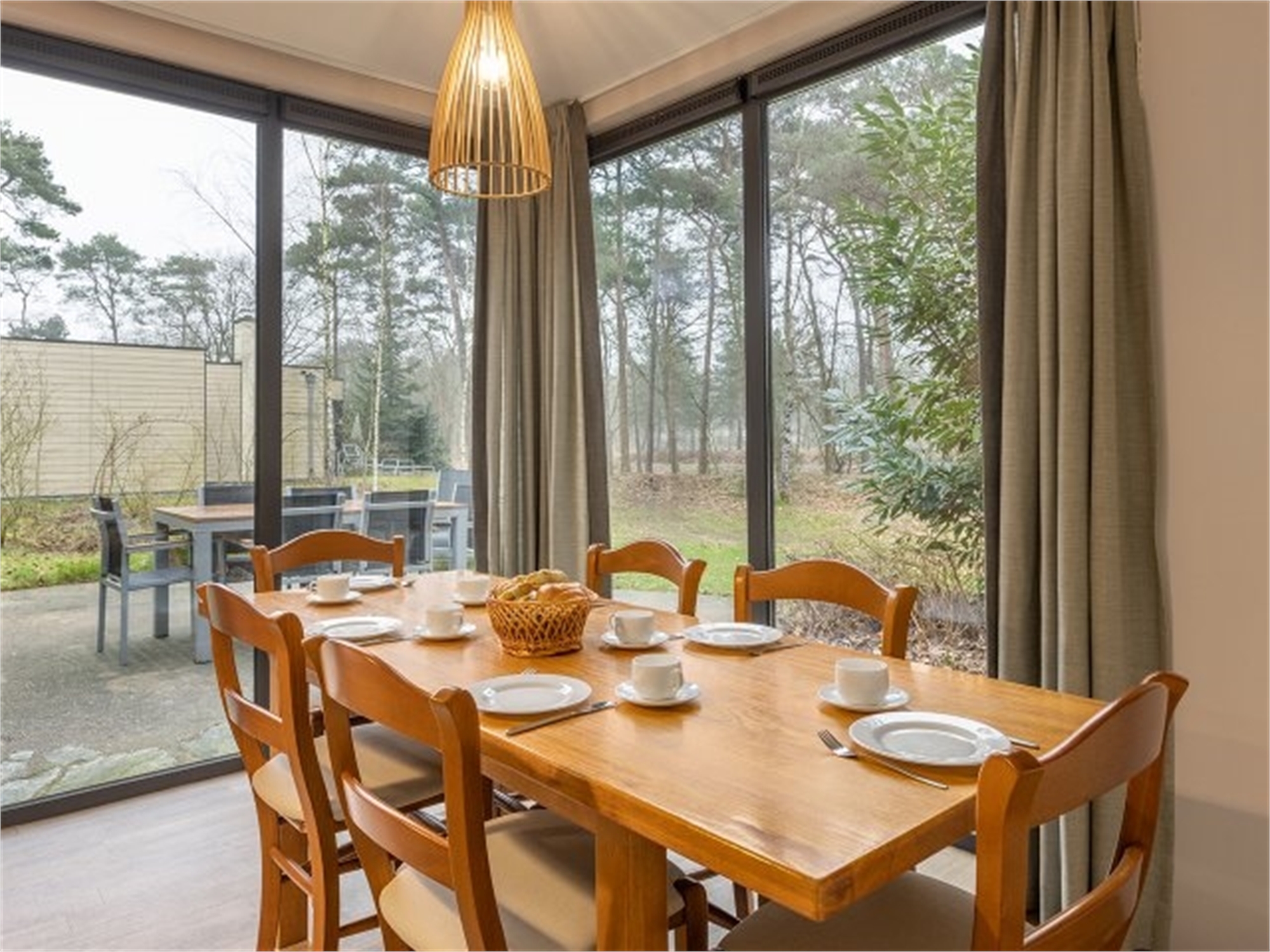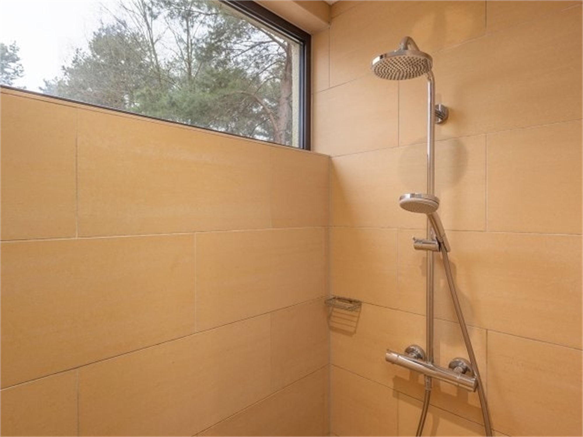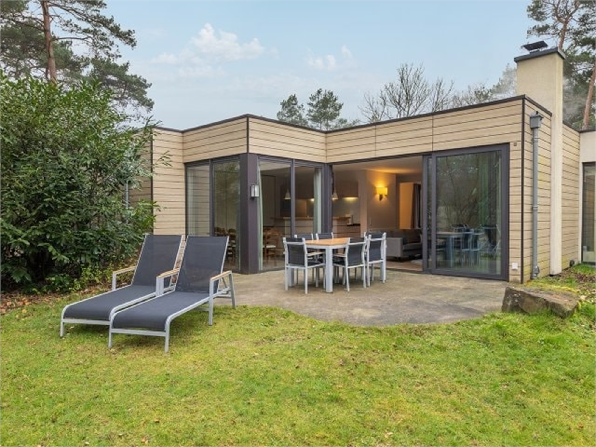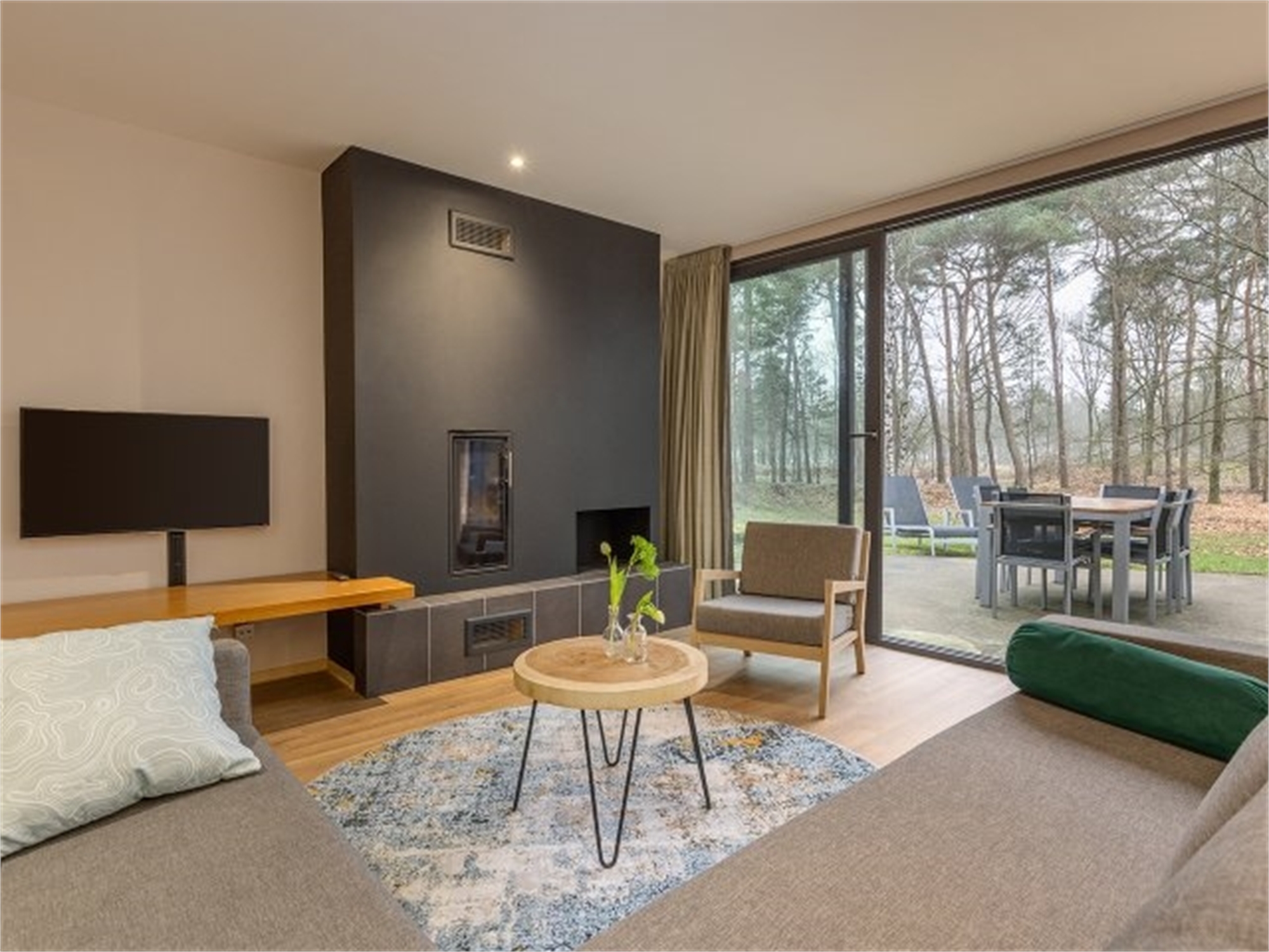 Durch die große Schiebetür wird Ihr Eden-Ferienhaus mit Sonnenlicht durchflutet. Öffne die Tür - und dein Wohnzimmer verschmilzt mit dem Garten. Ein Traum! Genieße den großzügigen Freiraum und den Komfort und entspanne am Kamin.