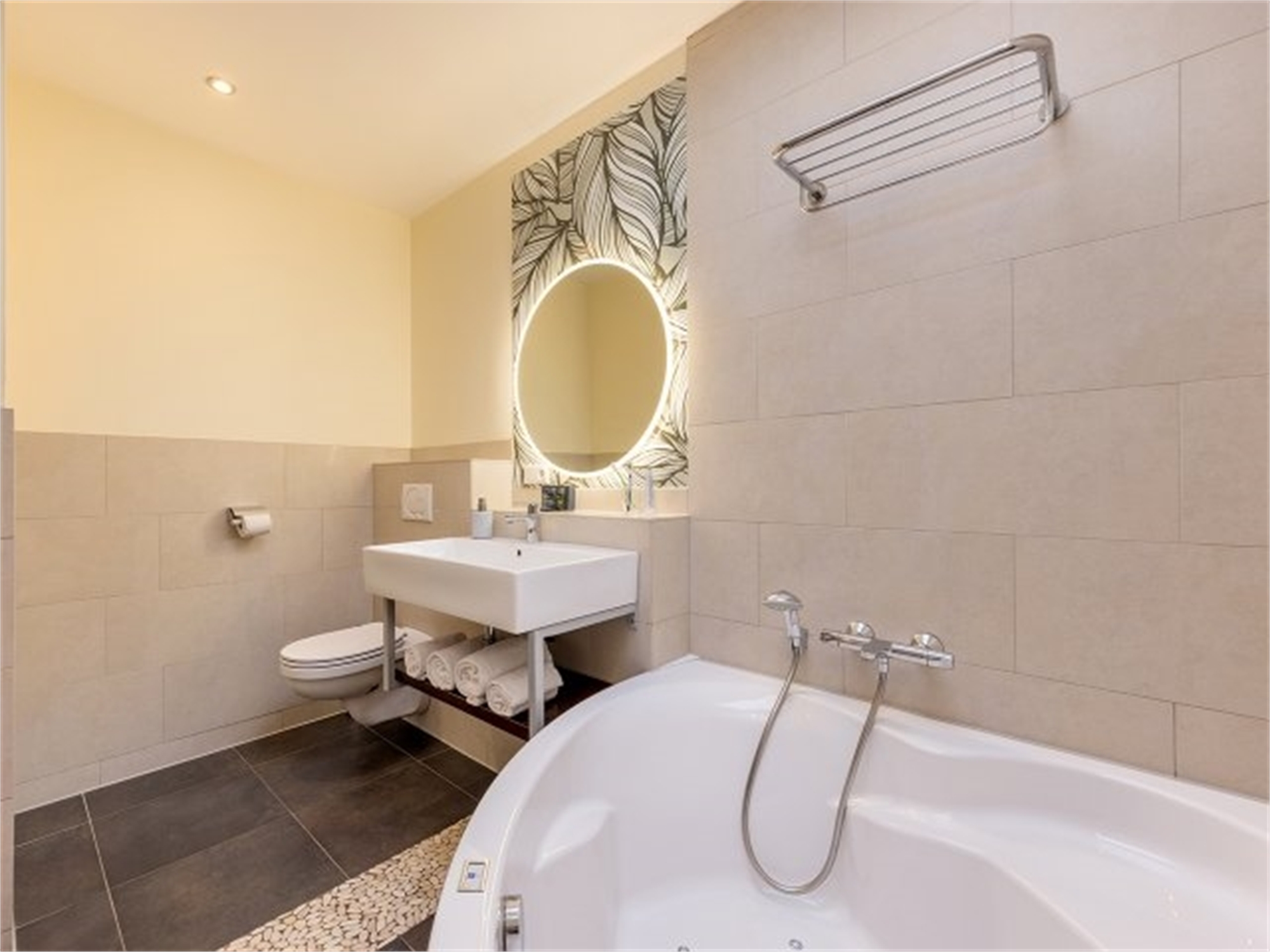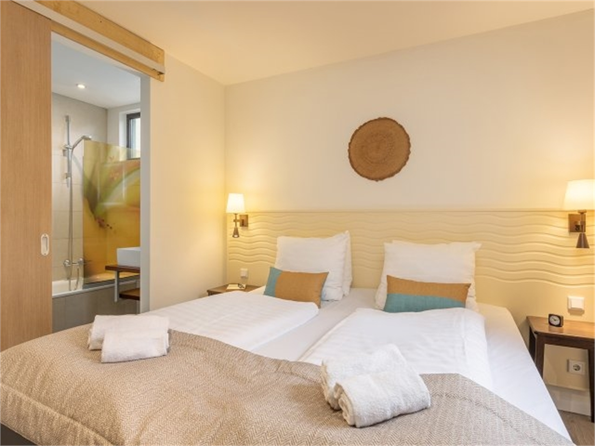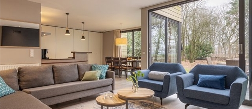 Durch die große Schiebetür wird Ihr Eden-Ferienhaus mit Sonnenlicht durchflutet. Öffnen Sie die Tür - und ihr Wohnzimmer verschmilzt mit dem Garten. Ein Traum! Genießen Sie den großzügigen Freiraum und den Komfort. Entspannen Sie am Kamin und werfen Sie den Grill an - für einen langen Sommerabend.