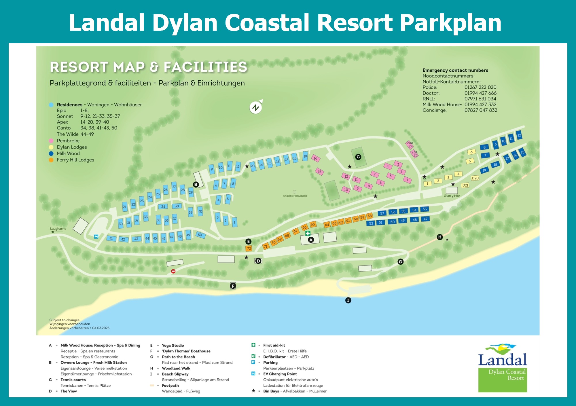Aktueller und übersichtlicher Parkplan von Landal Dylan Coastal Resort mit alle Unterkünfte und Einrichtungen, auch als PDF herunterladbar.