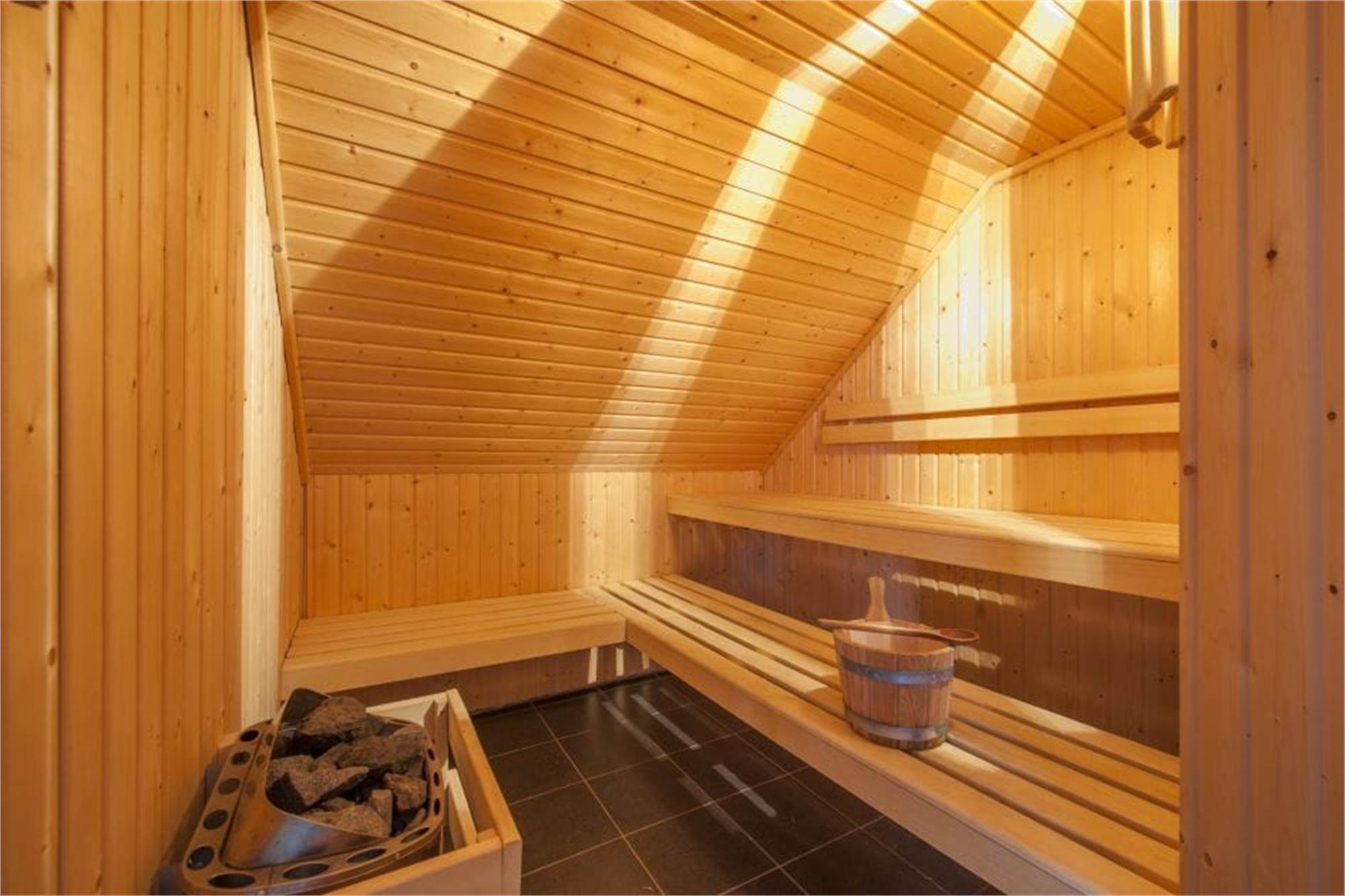 Obergeschoss: Wellnessraum mit Whirlpool und Sonnenbank. Traditionelle Sauna. Zwei Schlafzimmer mit je zwei Einzel- Boxpringbetten. Jedes Schlafzimmer verfügt über ein eigenes Badezimmer mit Dusche, Waschtisch und separater Toilette.