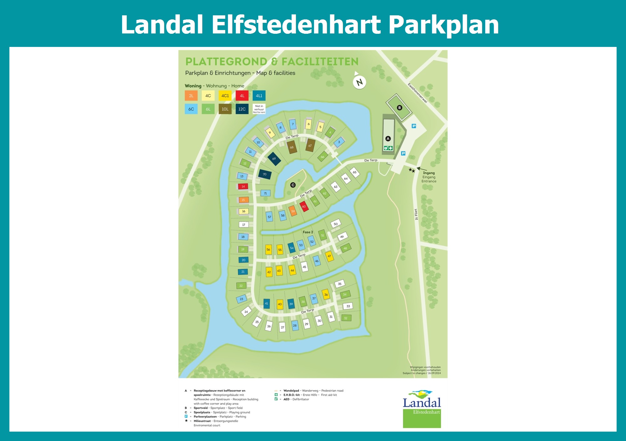 Aktueller und übersichtlicher Parkplan von Landal Elfstedenhart mit alle Unterkünfte und Einrichtungen, auch als PDF herunterladbar.