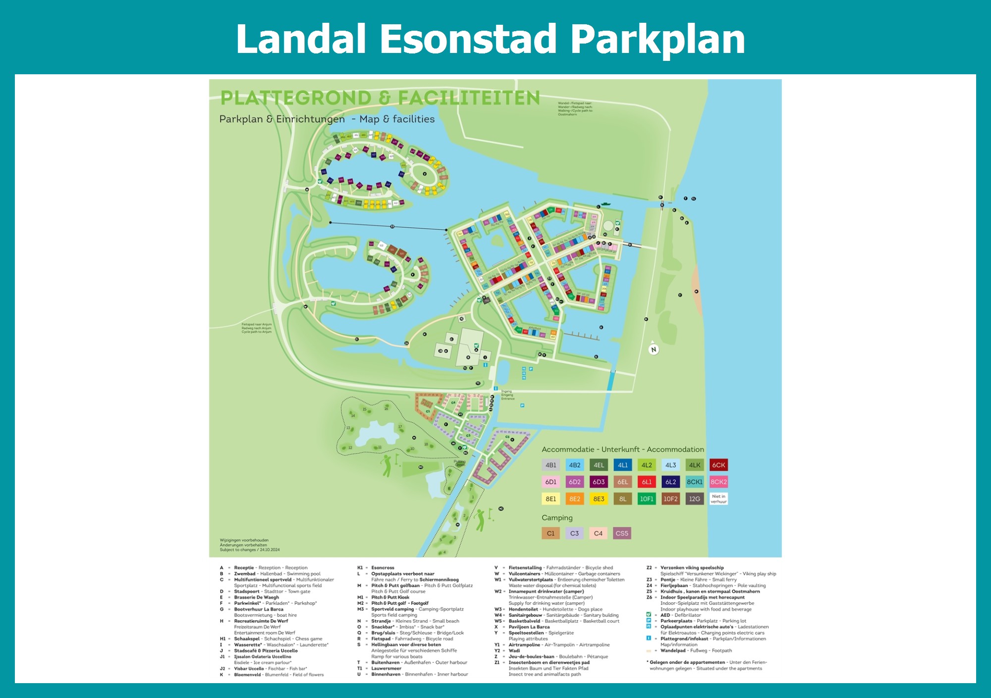 Aktueller und übersichtlicher Parkplan von Landal Esonstad mit alle Unterkünfte und Einrichtungen, auch als PDF herunterladbar.