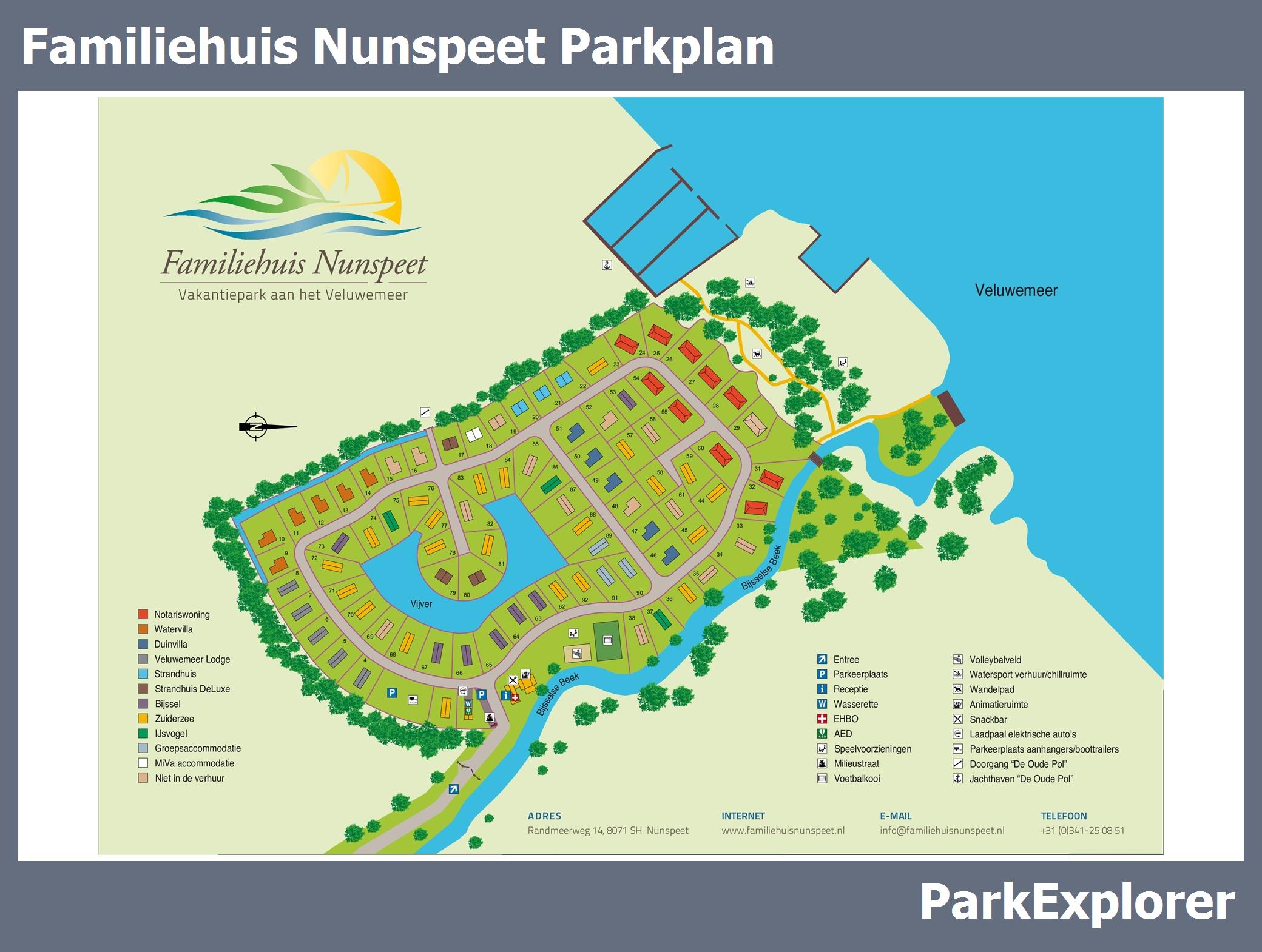 Aktueller und übersichtlicher Parkplan von Familiehuis Nunspeet mit alle Unterkünfte und Einrichtungen, auch als PDF herunterladbar.