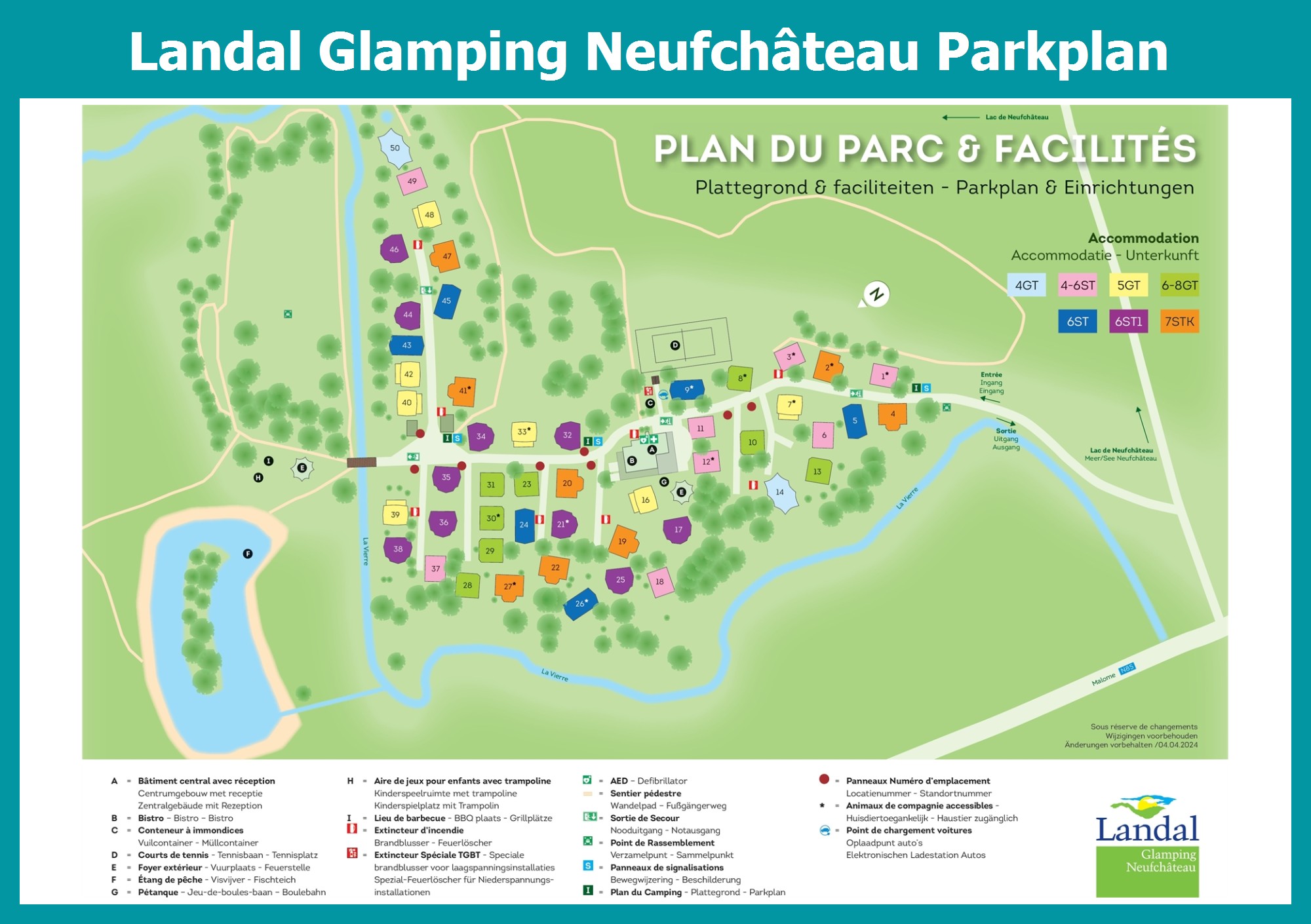 Aktueller und übersichtlicher Parkplan von Landal Glamping Neufchâteau mit alle Unterkünfte und Einrichtungen, auch als PDF herunterladbar.