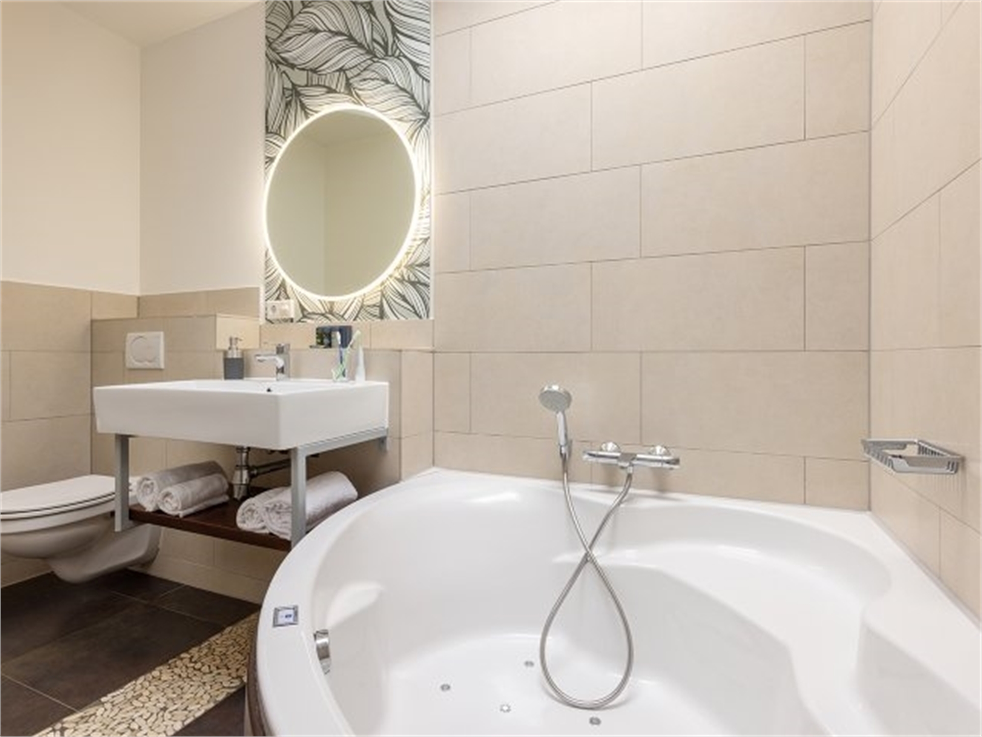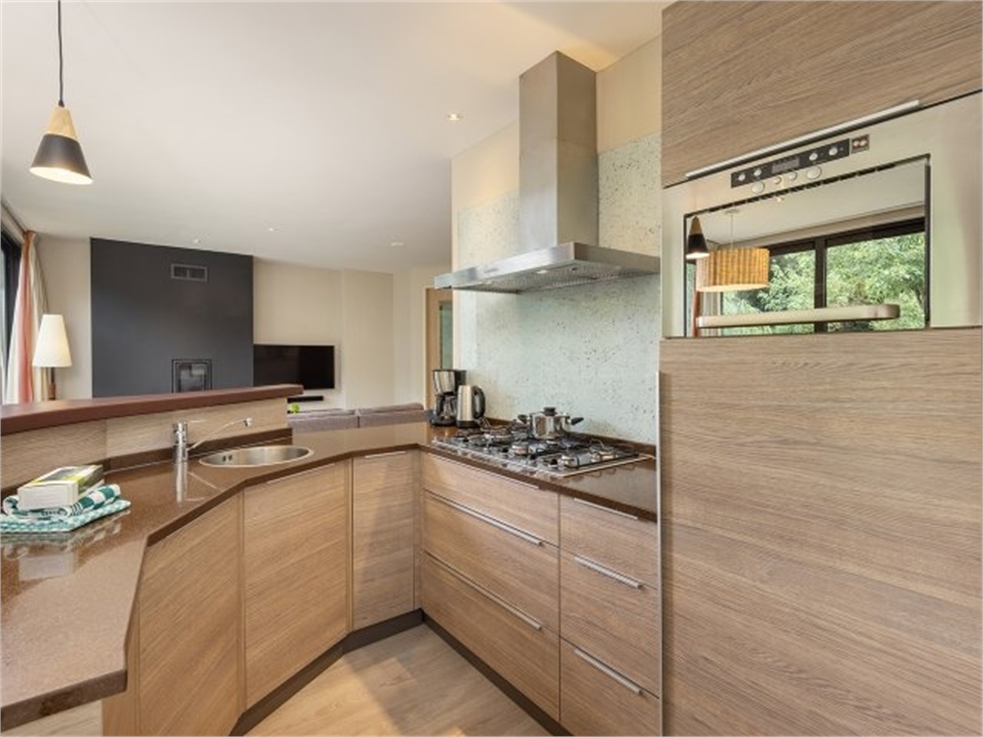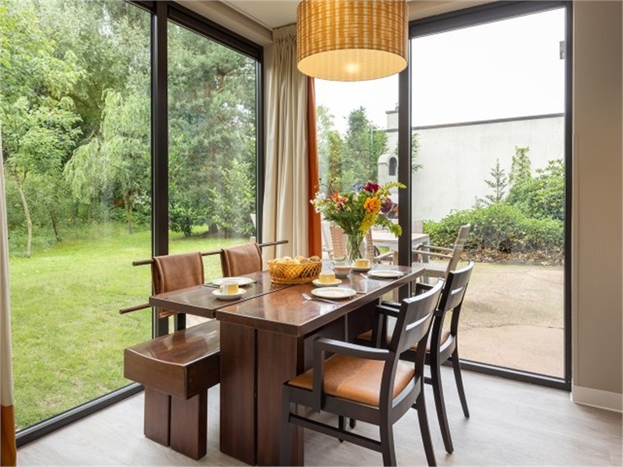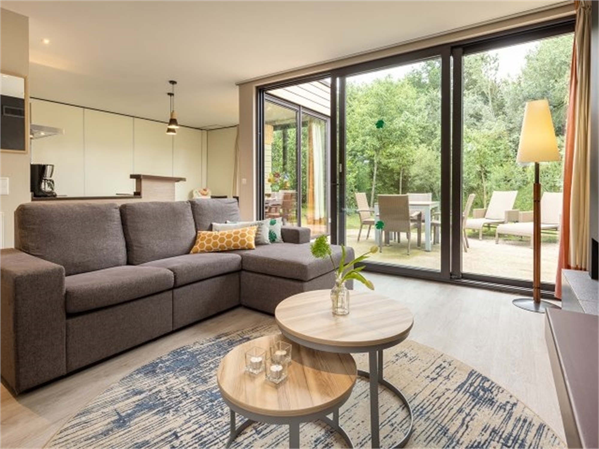 Durch die große Schiebetür wird Ihr Eden-Ferienhaus mit Sonnenlicht durchflutet. Öffnen Sie die Tür - und ihr Wohnzimmer verschmilzt mit dem Garten. Ein Traum! Genießen Sie den großzügigen Freiraum und den Komfort. Entspannen Sie am Kamin und werfen Sie den Grill an - für einen langen Sommerabend.