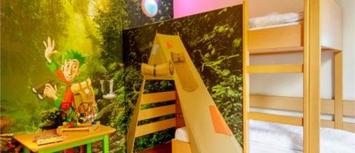 1 Schlafraum im Dschungel-Stil mit Kinder-Etagenbett, 1 Schlafzimmer mit 2 zusammenstehenden Einzelbetten, zweiter Fernseher, Bettdecken