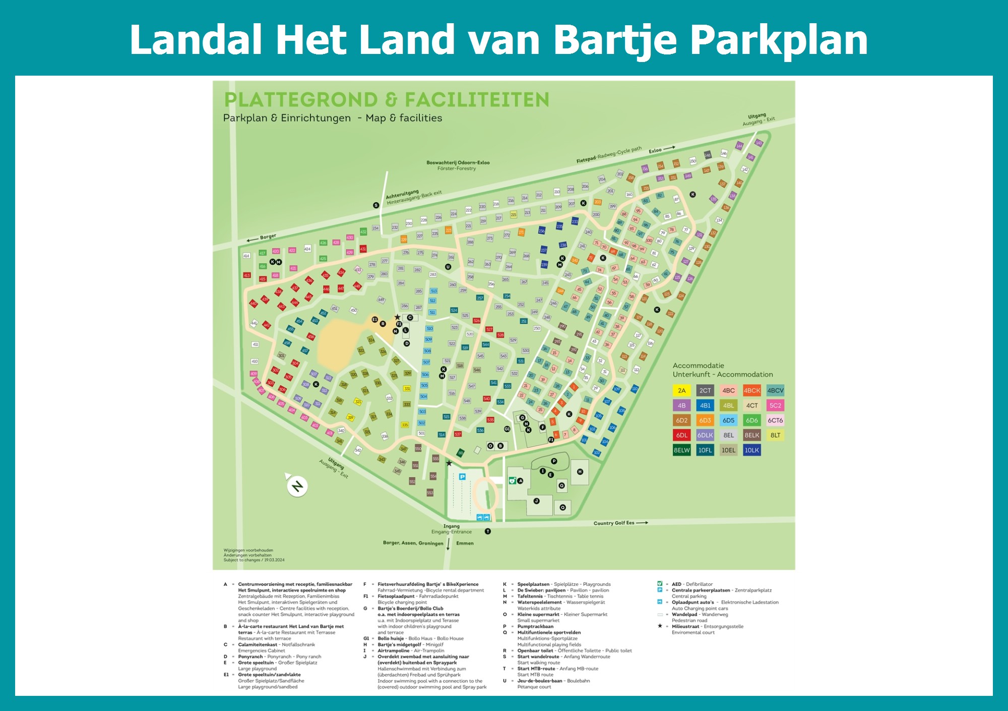 Aktueller und übersichtlicher Parkplan von Landal Het Land van Bartje mit alle Unterkünfte und Einrichtungen, auch als PDF herunterladbar.