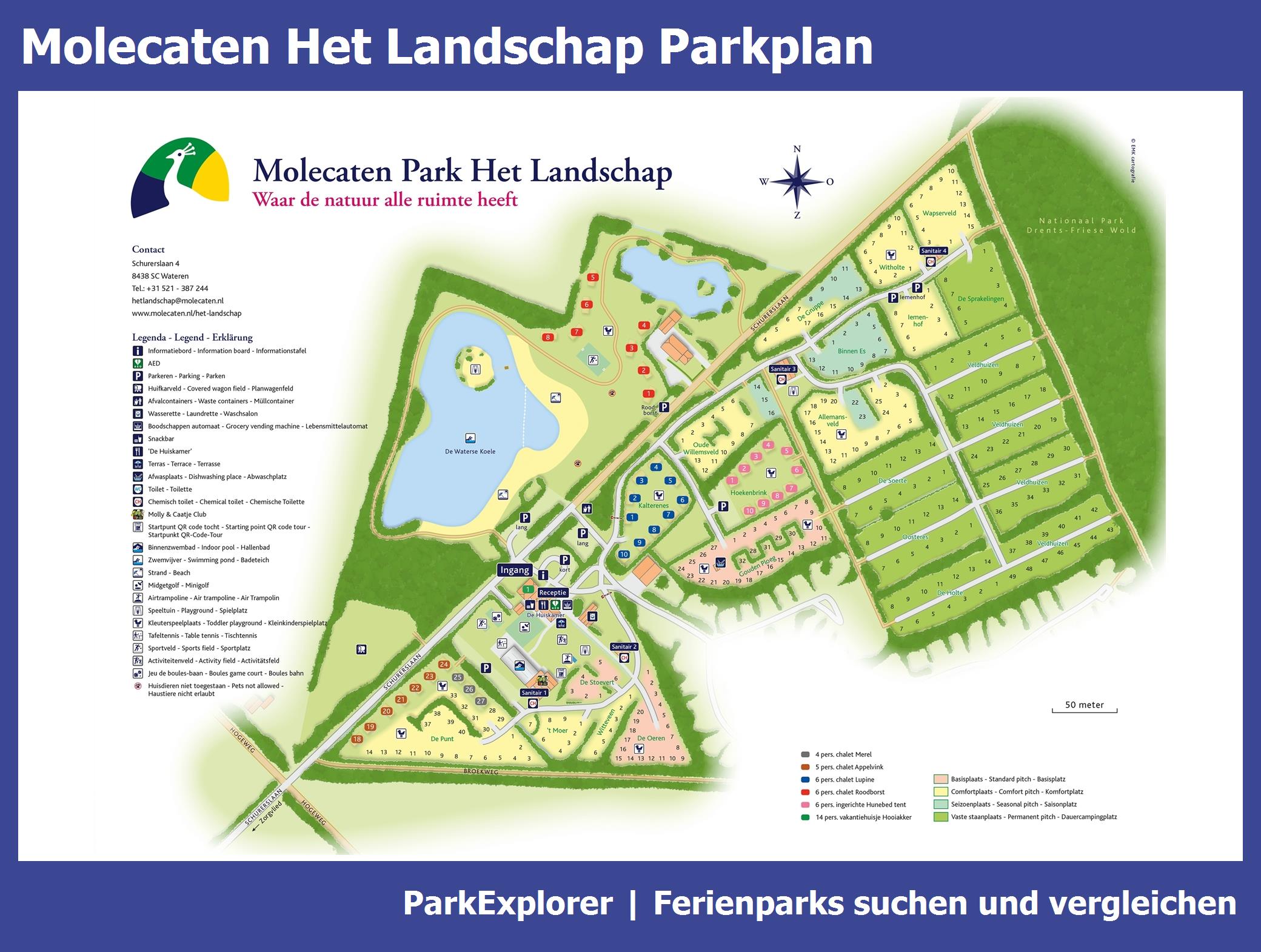 Aktueller und übersichtlicher Parkplan von Molecaten Het Landschap mit alle Unterkünfte und Einrichtungen, auch als PDF herunterladbar.