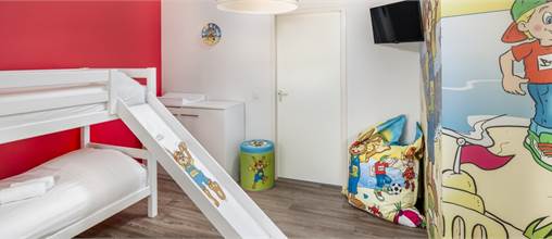 Koos-Bungalow für 4 Personen und ein Baby bzw. Kleinkind. Dieser Bungalow ist komplett im Koos Konijn Stil eingerichtet mit u. a. Koos Duschvorhang, Koos Esstisch, Kindertisch mit Stühlen im Wohnzimmer, Koos Sitzsack, Sitzkissen und Koos Türmatte. Außerdem ist die Unterkunft mit Kinderbett, Babywanne, Kinderstuhl und Laufstall generell besonders kinderfreundlich gestaltet. In der Unterkunft finden Sie ein gemütliches Wohnzimmer mit Sitzecke und Smart-TV. Die offene Küche ist mit Geschirrspüler, Kühlschrank mit integriertem Gefrierfach, Kombi-Mikrowelle und Kaffeemaschine ausgestattet. Die Unterkunft bietet insgesamt 2 Schlafzimmer: 1 Schlafzimmer mit 2 Einzelbetten und einem Kinderbettchen und 1 Schlafzimmer im Koos Konijn Stil mit Etagenbett und Rutsche. Außerdem gibt es ein Badezimmer mit Dusche und Badewanne sowie ein separates Gäste-WC im Flur. Im Außenbereich finden Sie einen schönen Garten, eine möblierte Terrasse und einen Abstellraum. Die Nutzung von WiFi ist gratis.