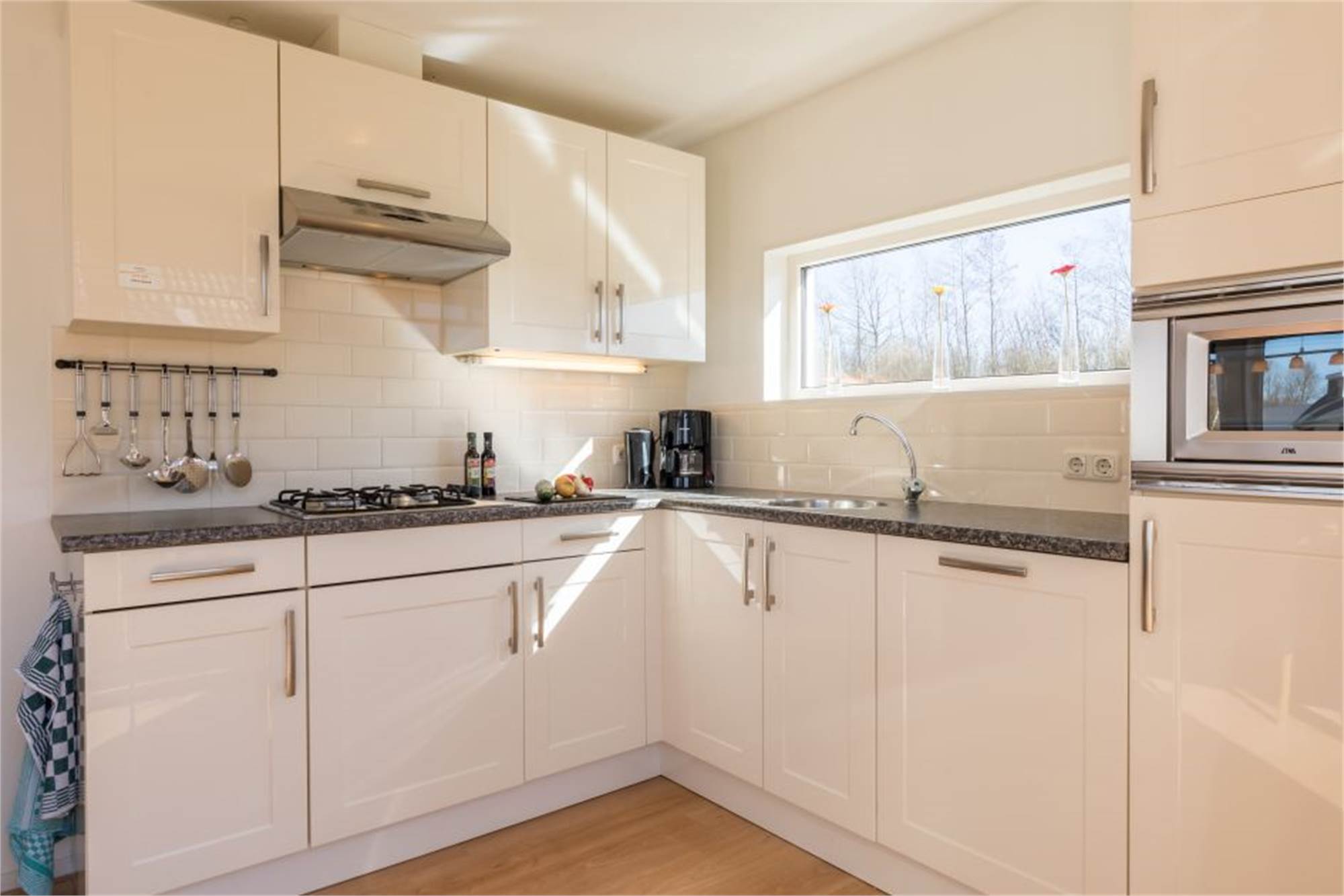 Erdgeschoss: großes Wohnzimmer, offene Küche mit Essecke, Mikrowelle und Geschirrspüler, ein Doppelzimmer, Abstellraum mit Waschmaschine und Trockner, großes Badezimmer mit Dusche, separate Toilette. Badewanne als Sonderwunsch buchbar. Sonnenterrasse mit Gartenmöbeln.