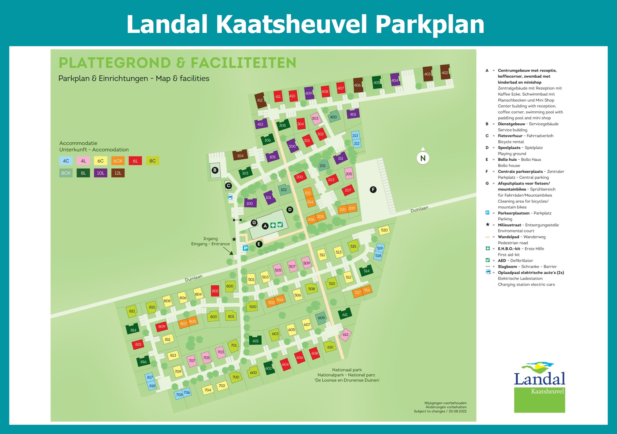 Aktueller und übersichtlicher Parkplan von Landal Kaatsheuvel mit alle Unterkünfte und Einrichtungen, auch als PDF herunterladbar.