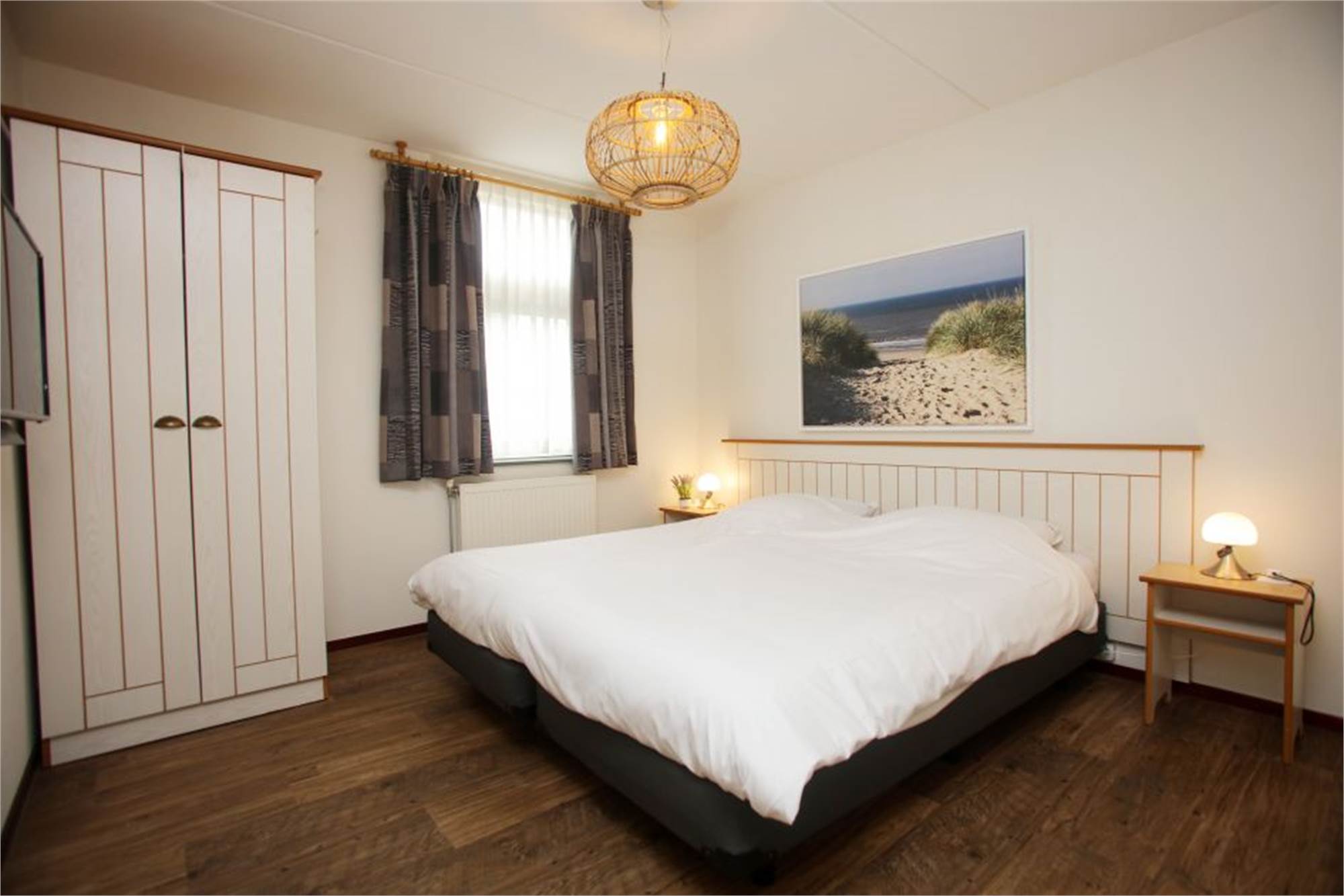 Dieser freistehende, restylte Bungalow eignet sich für 6 Personen und bietet ein großes, modern eingerichtetes Wohnzimmer mit gemütlicher Sitzecke und ein Smart-TV. Die offene Küche ist mit Geschirrspüler, Kühlschrank mit Gefrierfach und Kombi-Mikrowelle ausgestattet. Außerdem verfügt der Bungalow über drei hübsche Schlafzimmer mit insgesamt 6 Einzel-Boxspringbetten. Zwei Schlafzimmer befinden sich im Obergeschoss und eines im Erdgeschoss. Auf beiden Etagen finden Sie ein Badezimmer mit Dusche. Der Garten ist großzügig angelegt und bietet eine möblierte Terrasse sowie 2 Sonnenliegen. Im Bungalow steht Ihnen WiFi gratis zur Verfügung.