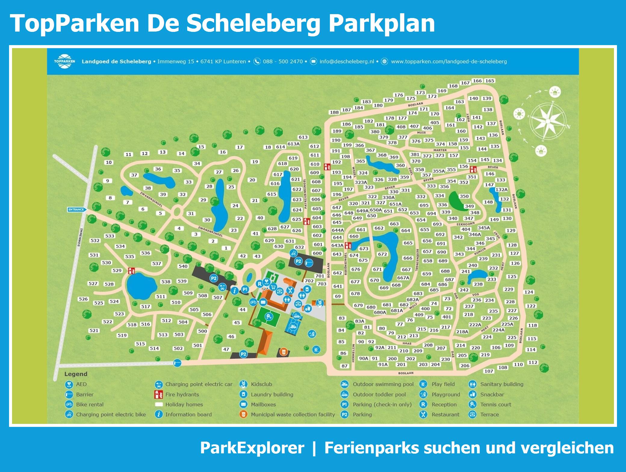 Aktueller und übersichtlicher Parkplan von TopParken De Scheleberg mit alle Unterkünfte und Einrichtungen, auch als PDF herunterladbar.
