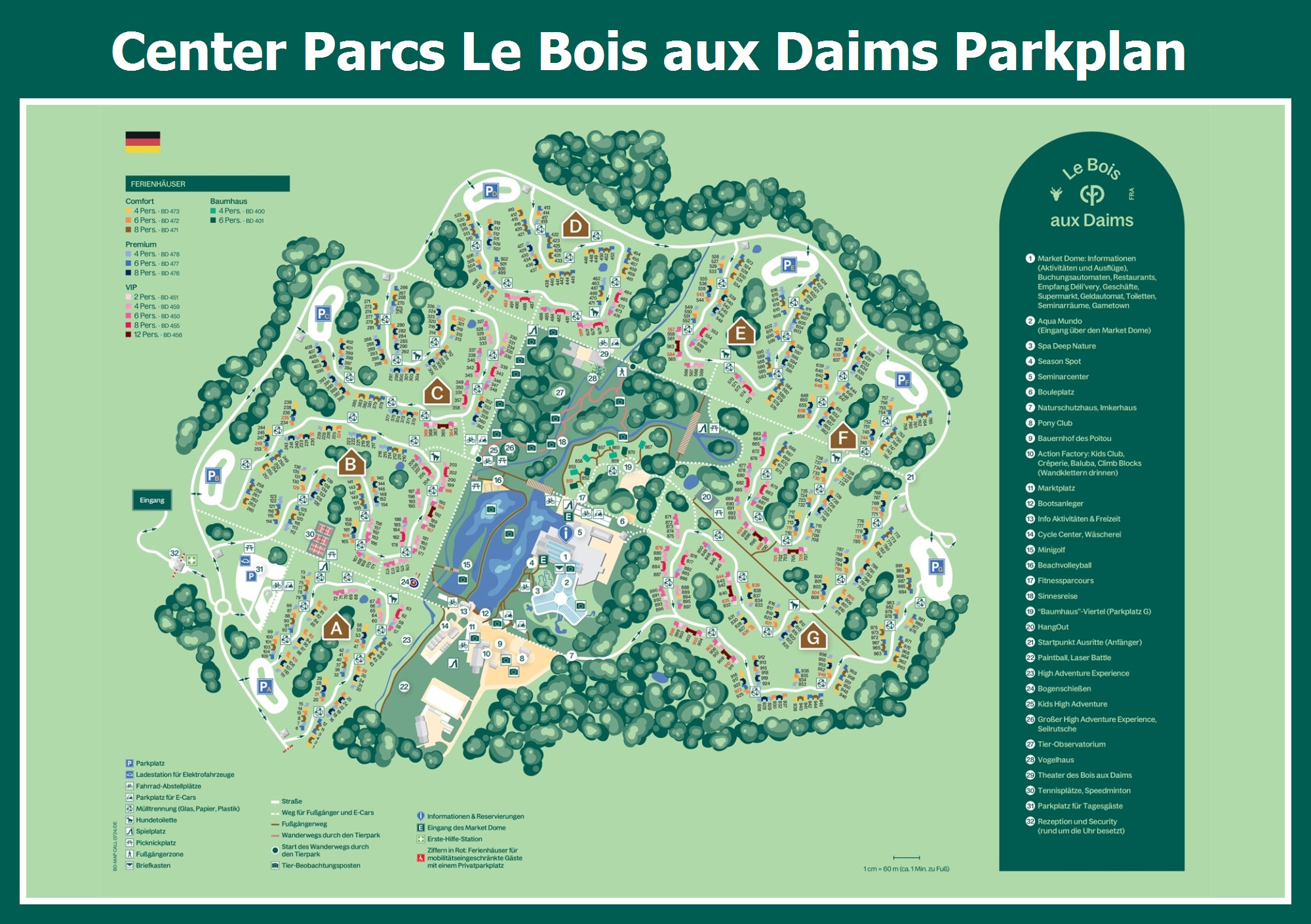 Aktueller und übersichtlicher Parkplan von Center Parcs Le Bois aux Daims mit alle Unterkünfte und Einrichtungen, auch als PDF herunterladbar.