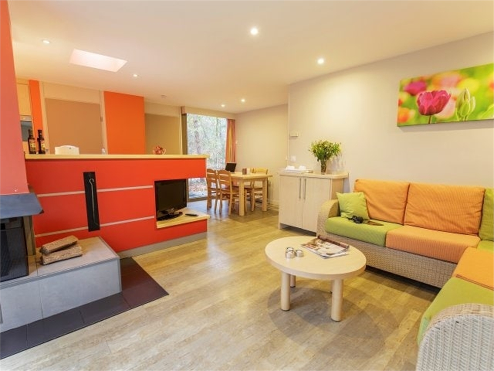 Wohnzimmer mit offenem Kamin, Flachbild-Fernseher