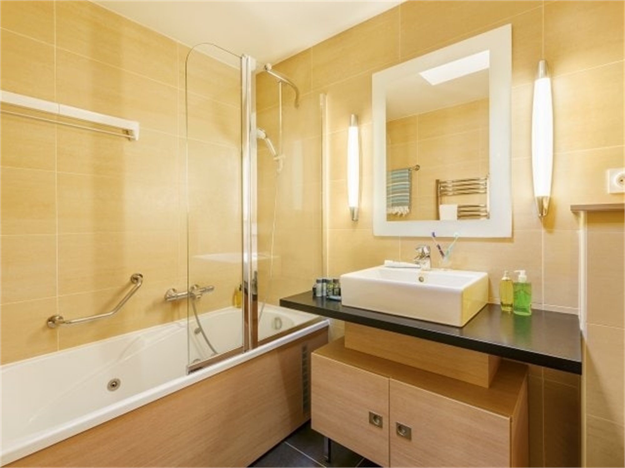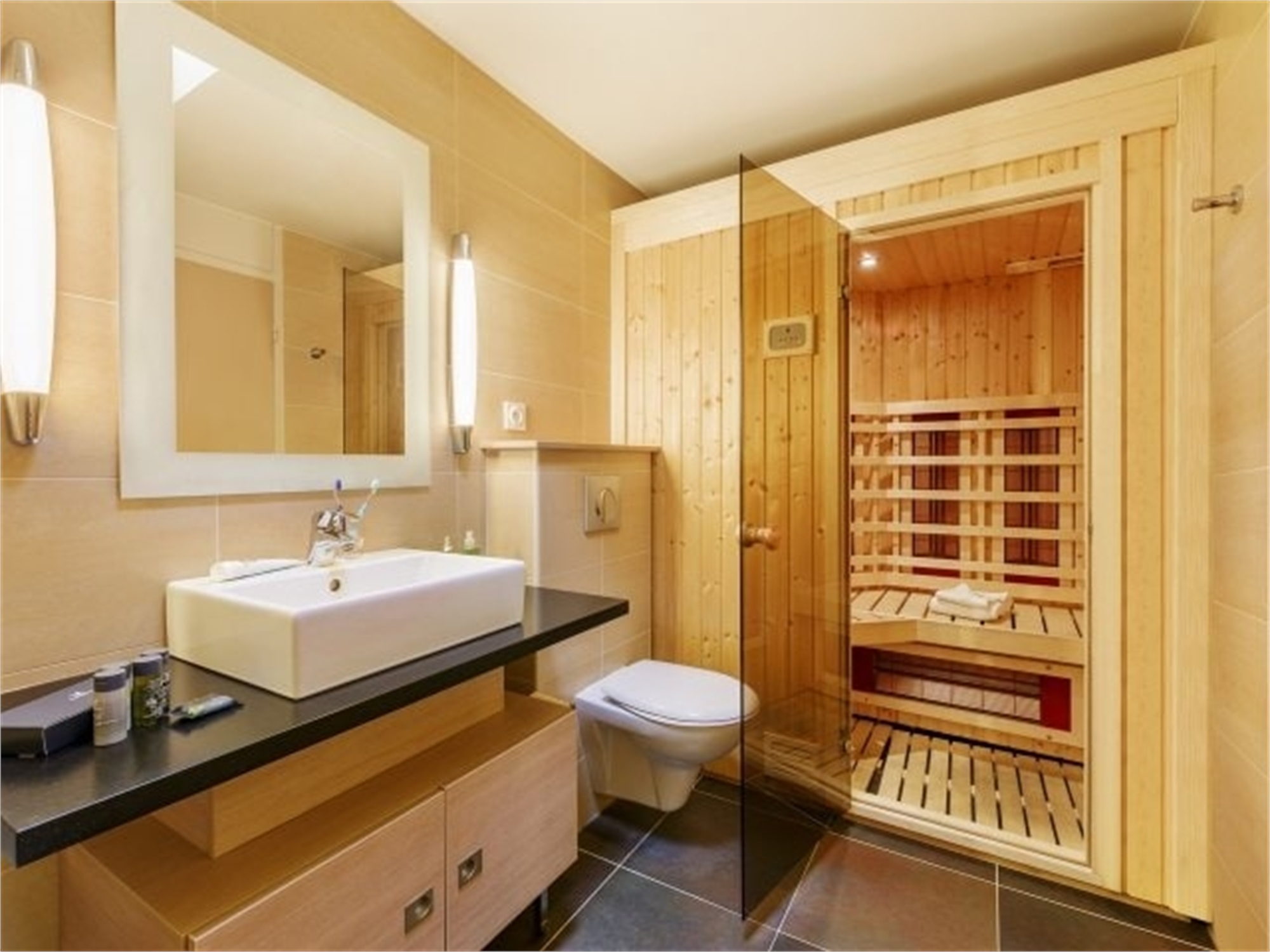 2 Badezimmer: 1 mit Badewanne mit Whirlpool-Funktion, Waschbecken und Infrarot-Sauna, 1 mit Regendusche und Waschbecken