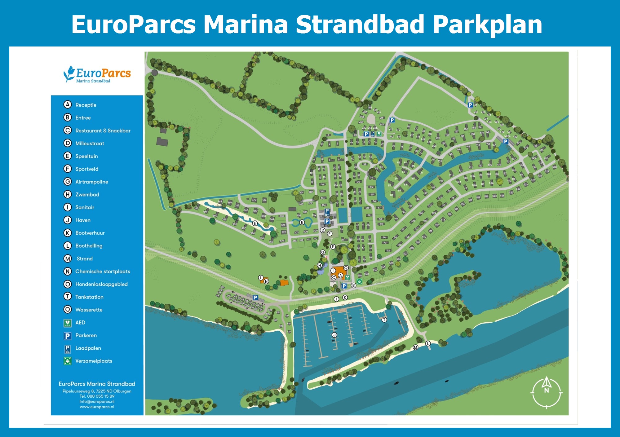 Aktueller und übersichtlicher Parkplan von EuroParcs Marina Strandbad mit alle Unterkünfte und Einrichtungen, auch als PDF herunterladbar.