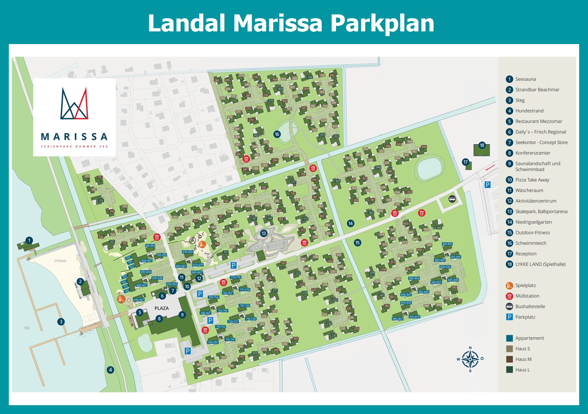 Aktueller und übersichtlicher Parkplan von Landal Marissa mit alle Unterkünfte und Einrichtungen, auch als PDF herunterladbar.