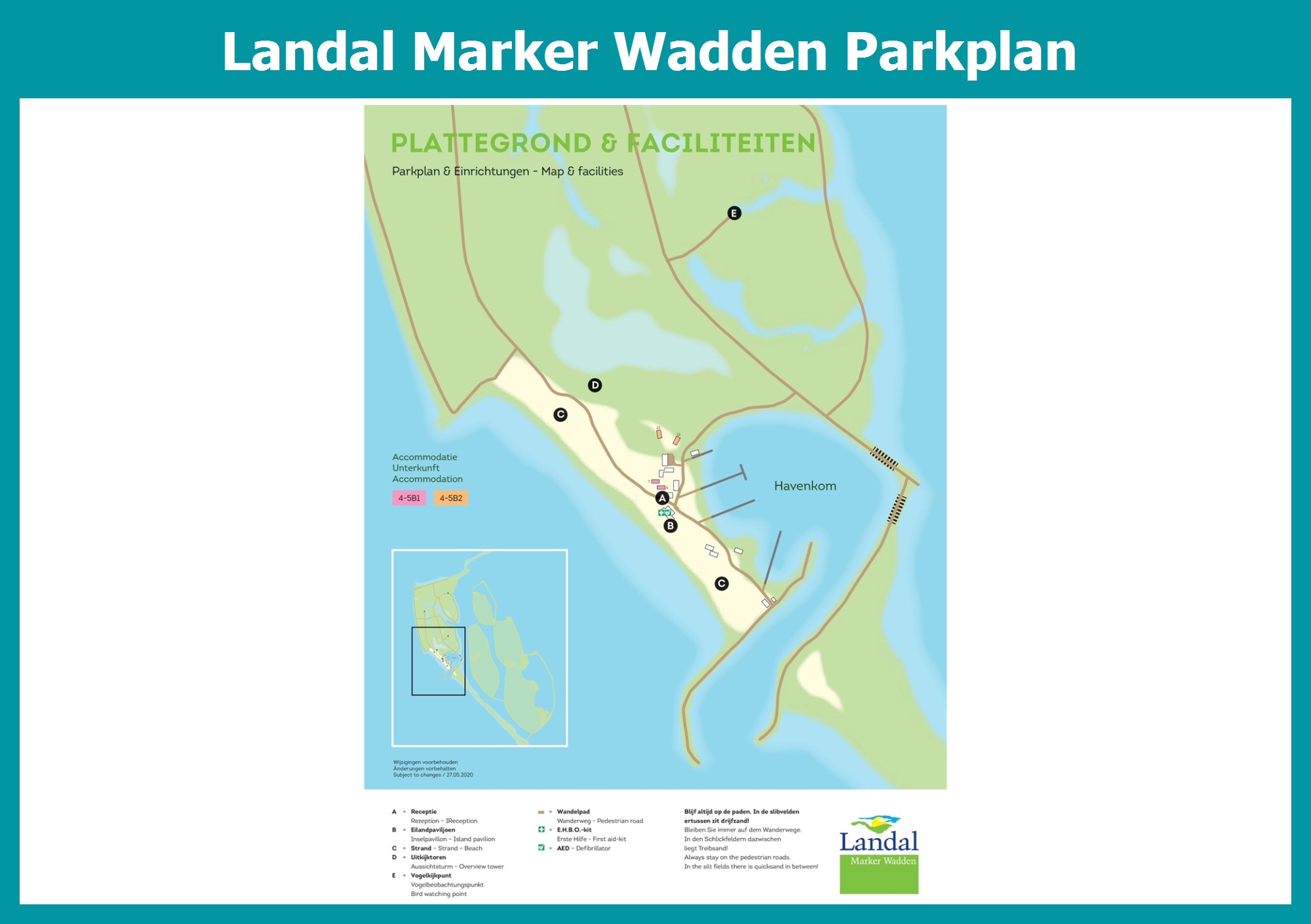 Aktueller und übersichtlicher Parkplan von Landal Marker Wadden mit alle Unterkünfte und Einrichtungen, auch als PDF herunterladbar.