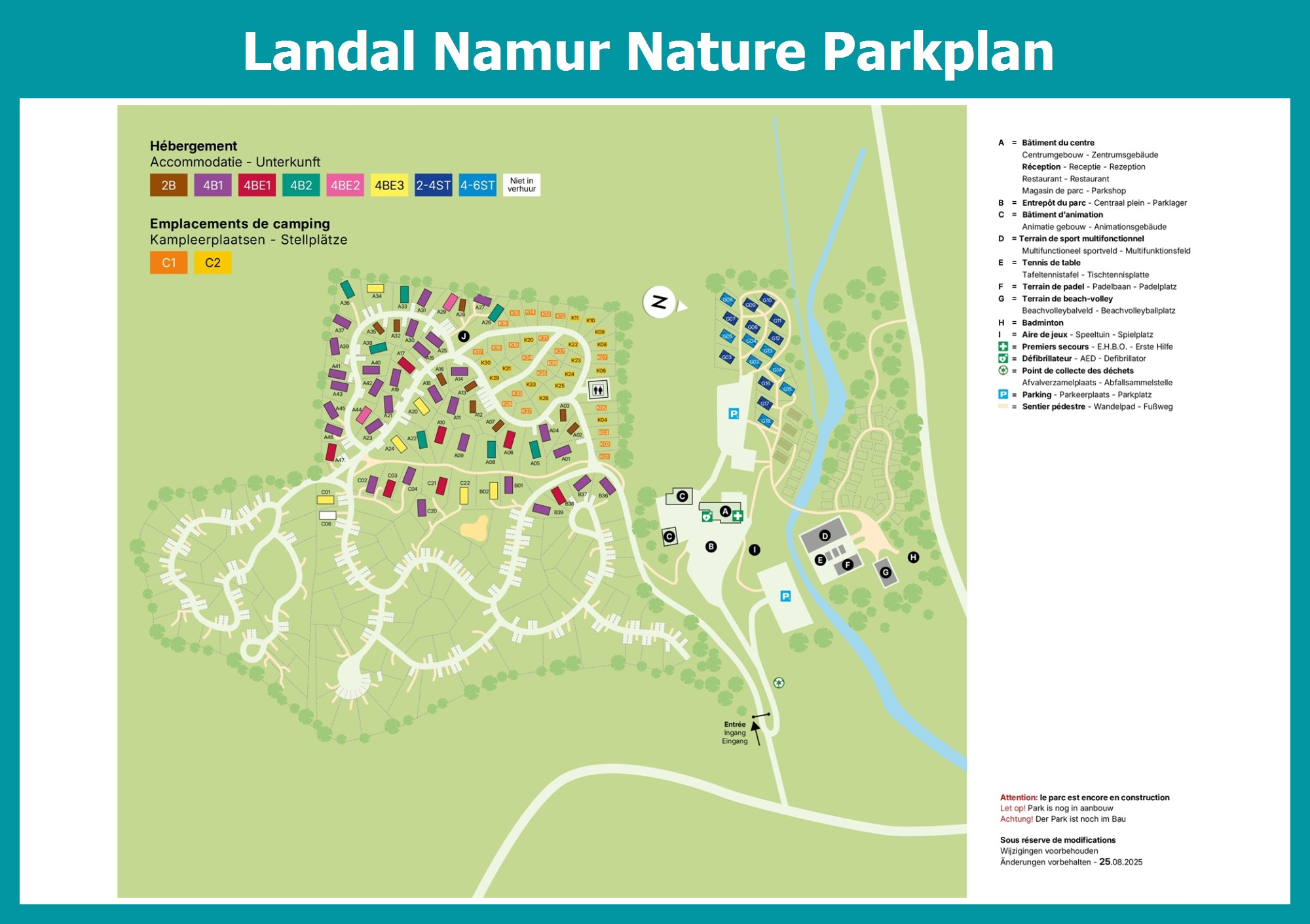 Aktueller und übersichtlicher Parkplan von Landal Namur Nature mit alle Unterkünfte und Einrichtungen, auch als PDF herunterladbar.