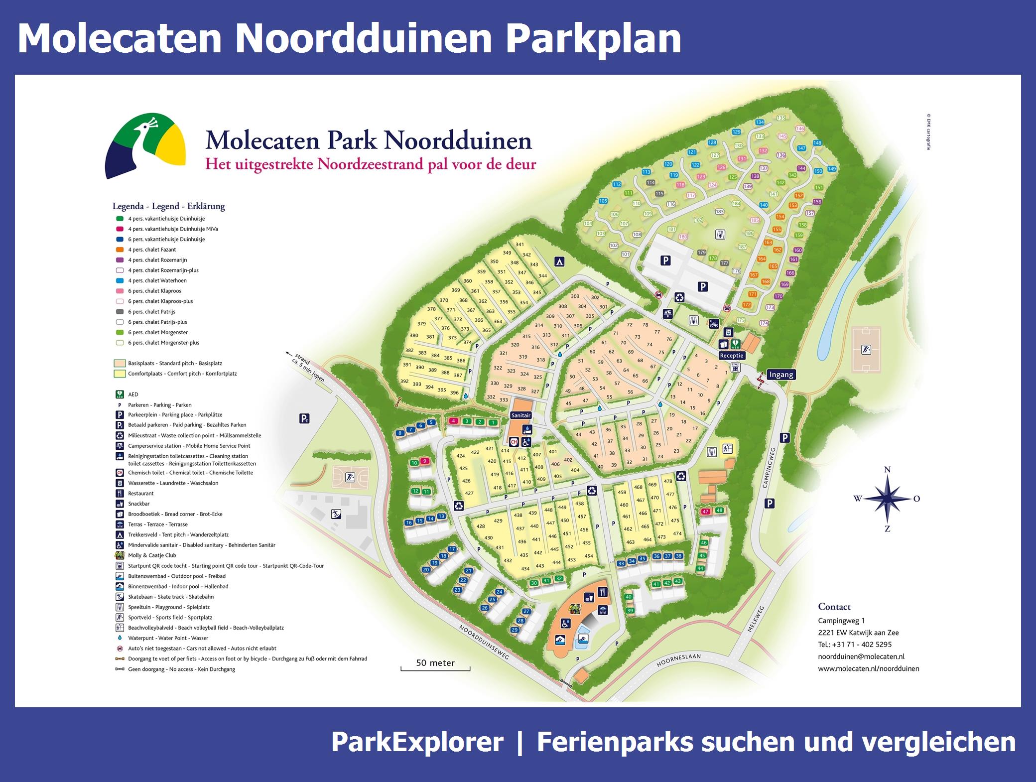 Aktueller und übersichtlicher Parkplan von Molecaten Noordduinen mit alle Unterkünfte und Einrichtungen, auch als PDF herunterladbar.