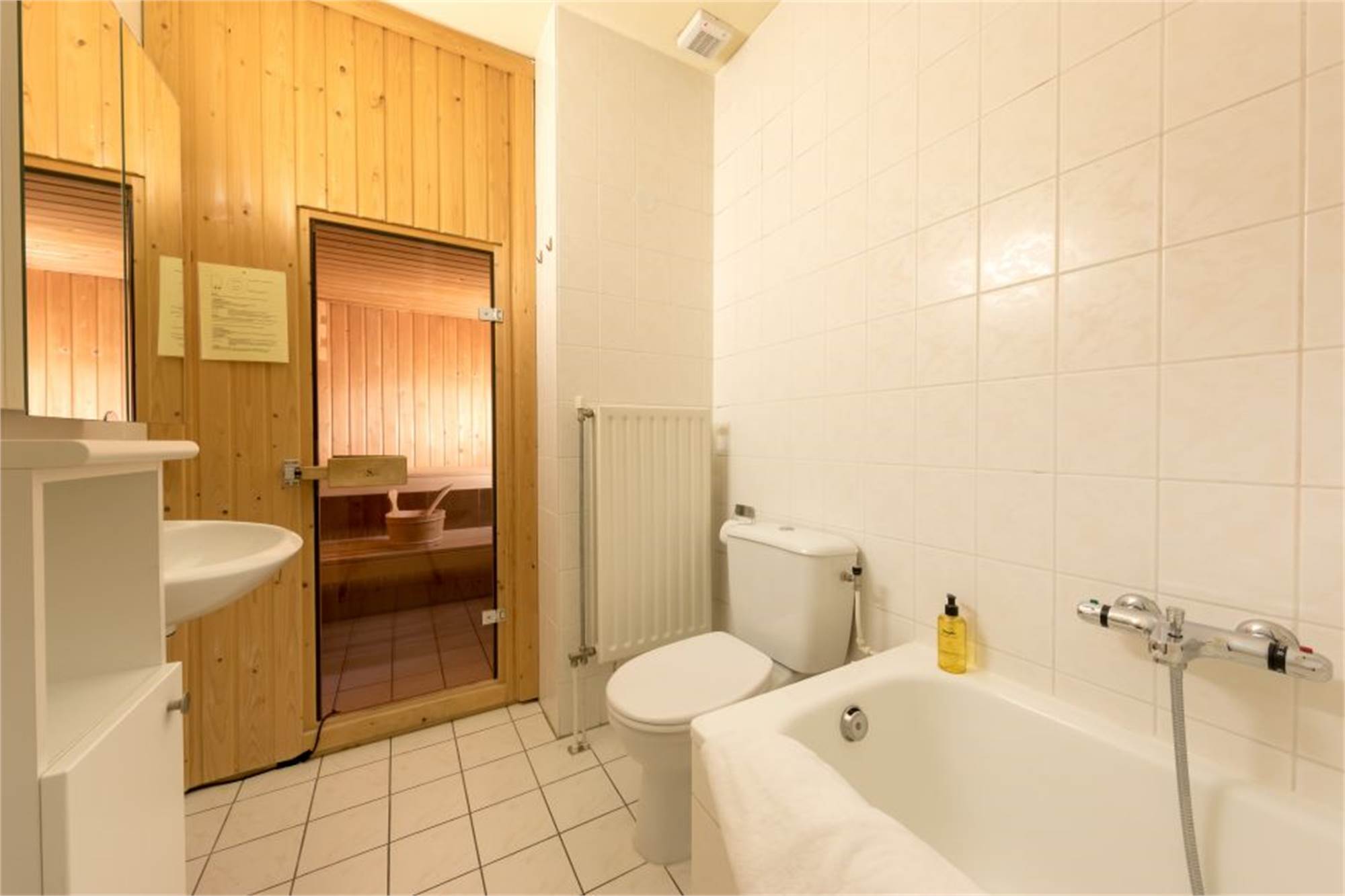 Diese versetzt gebaute Villa mit Obergeschoss eignet sich für 5 Personen. Es gibt eine Sitzecke mit TV-Gerät und eine Küche mit u. a. mit Kühlschrank mit Gefrierfach und Kaffeemaschine. Im Obergeschoss befinden sich 2 Schlafzimmer mit Einzel-Boxspringbetten sowie ein Badezimmer mit Sauna und Badewanne. Die Villa bietet außerdem einen Abstellraum, einen schönen Garten mit Gartenmöbeln und eine Parkmöglichkeit für ein Auto. Die Nutzung von WiFi ist gratis.
