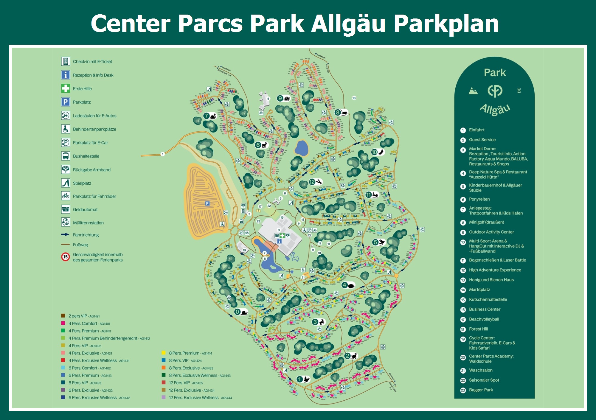 Aktueller und übersichtlicher Parkplan von Center Parcs Park Allgäu mit alle Unterkünfte und Einrichtungen, auch als PDF herunterladbar.