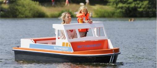 Hier könnt ihr Kinder an das Ruder des Feuerwehr-, Polizei- oder Delfin (rosa) Tour Bootes. Mama und Papa nehmen als Matrosen natürlich im Heck Platz! Fahrzeit beträgt 25 Minuten
