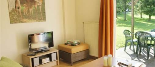 Heimkinosystem mit DVD-Spieler, Flatscreen-TV, Laminatboden, Zugang zur privaten Terrasse mit Außenmöbeln, Sitzgarnitur der Personenzahl entsprechend