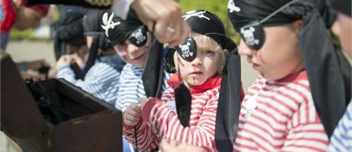 Augenklappe auf, einen Bart anmalen und da sind die coolen Piratenkids: auf der Jagd nach dem Schatz unter Führung unseres Betreuerteams. Was verbirgt sich wohl in der Kiste?