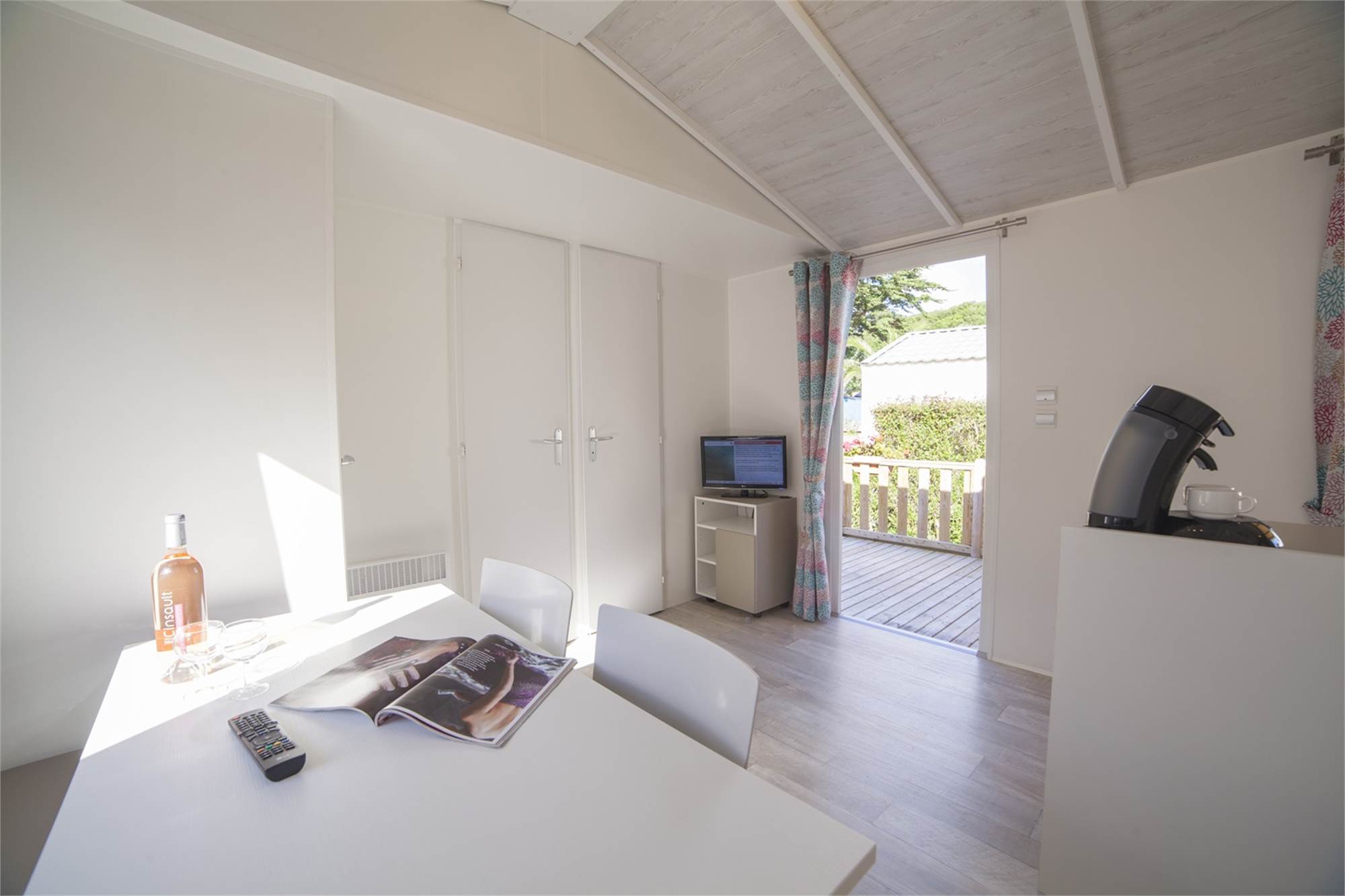 Ausstattungsmerkmale Essecke für 4 Personen Doppelterrassentüren Gasheizofen Extérieur Terrassenmöbel Parken bei der Unterkunft Holzterrasse Veranda Liegebetten Terrassenheizung Audio/Video/Elektronik Internet WIFI im Park Flatscreen Fernseher Küche Wasserkocher Kühlschrank mit Gefrierfach Moderne offene Küche 4-flammiger Gasherd Senseo Kaffeemaschine Mikrowellenherd Schlafen Deckbetten Zimmer mit 2 Einzelbetten Zimmer mit einem Doppelbett Anzahl Schlafzimmer: 2 Sanitäranlagen Duschkabine Großes Waschbecken Sondermerkmale