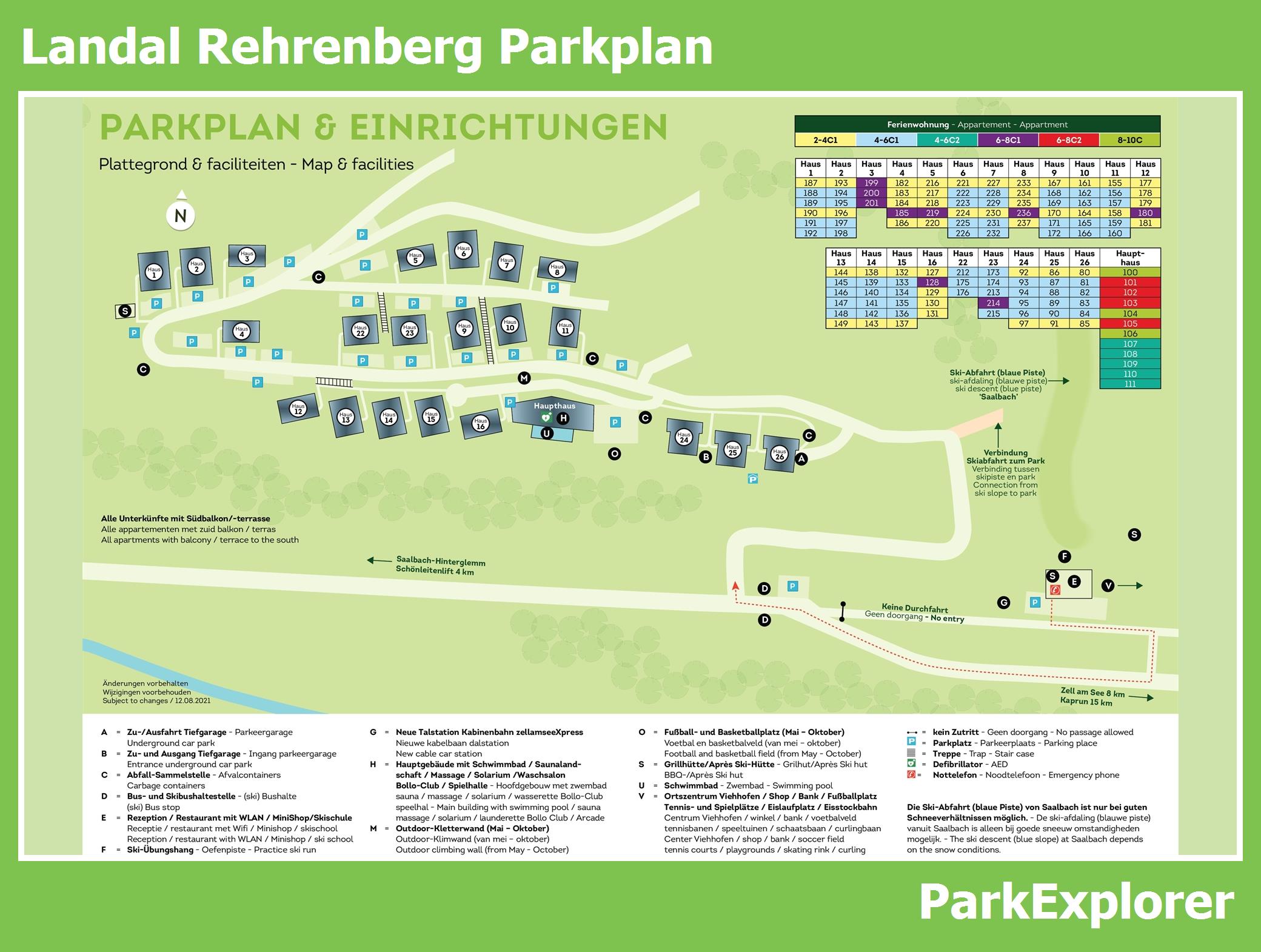 Aktueller und übersichtlicher Parkplan von Landal Rehrenberg mit alle Unterkünfte und Einrichtungen, auch als PDF herunterladbar.