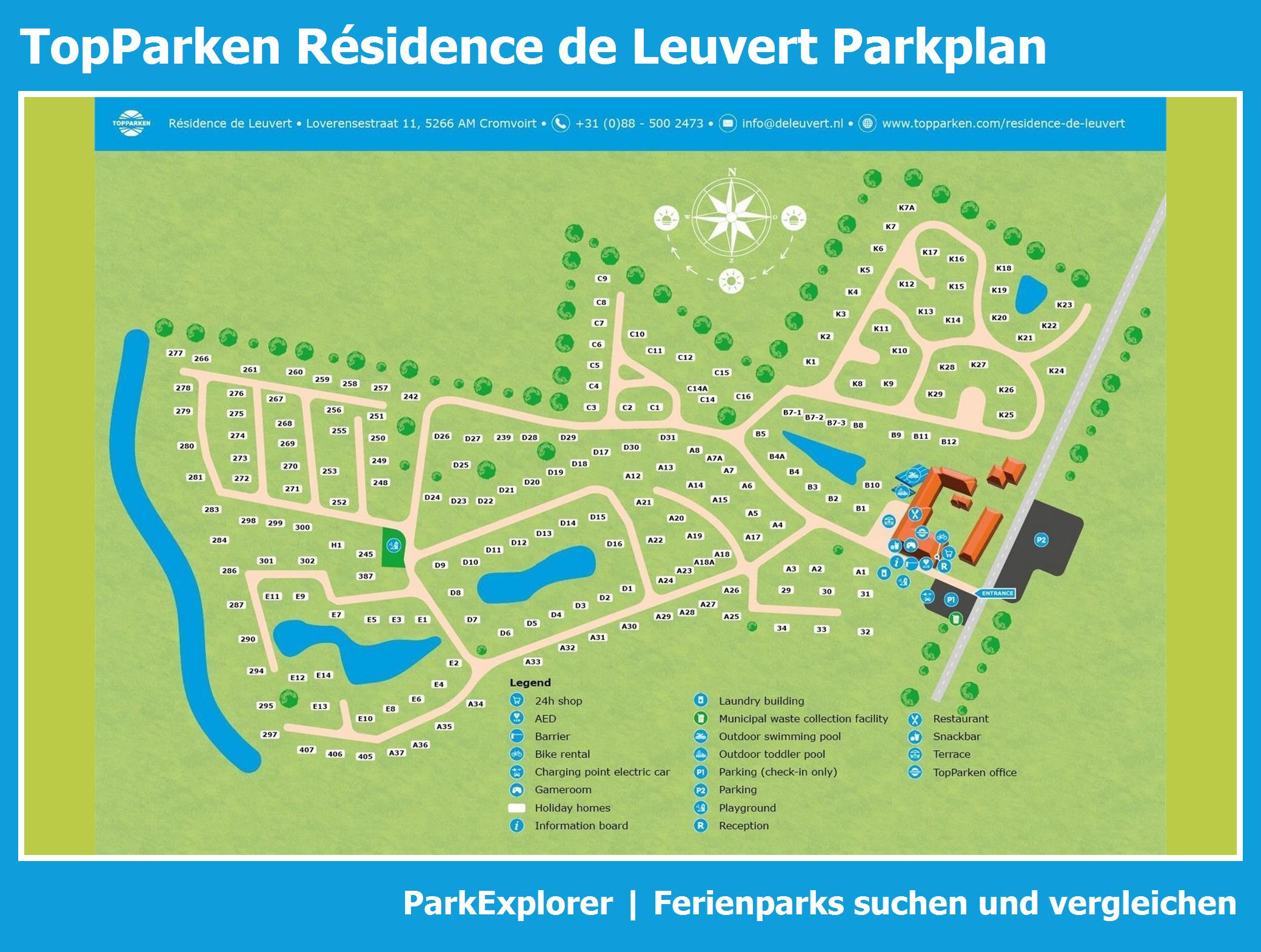 Aktueller und übersichtlicher Parkplan von TopParken Résidence de Leuvert mit alle Unterkünfte und Einrichtungen, auch als PDF herunterladbar.