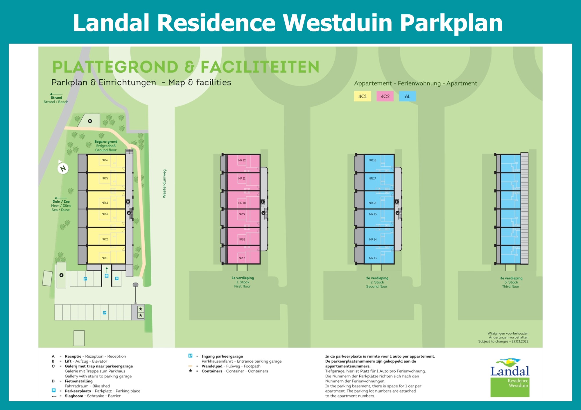 Aktueller und übersichtlicher Parkplan von Landal Residence Westduin mit alle Unterkünfte und Einrichtungen, auch als PDF herunterladbar.