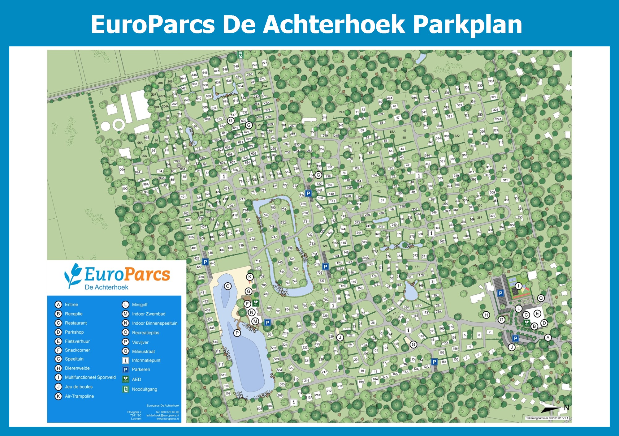 Aktueller und übersichtlicher Parkplan von EuroParcs De Achterhoek mit alle Unterkünfte und Einrichtungen, auch als PDF herunterladbar.