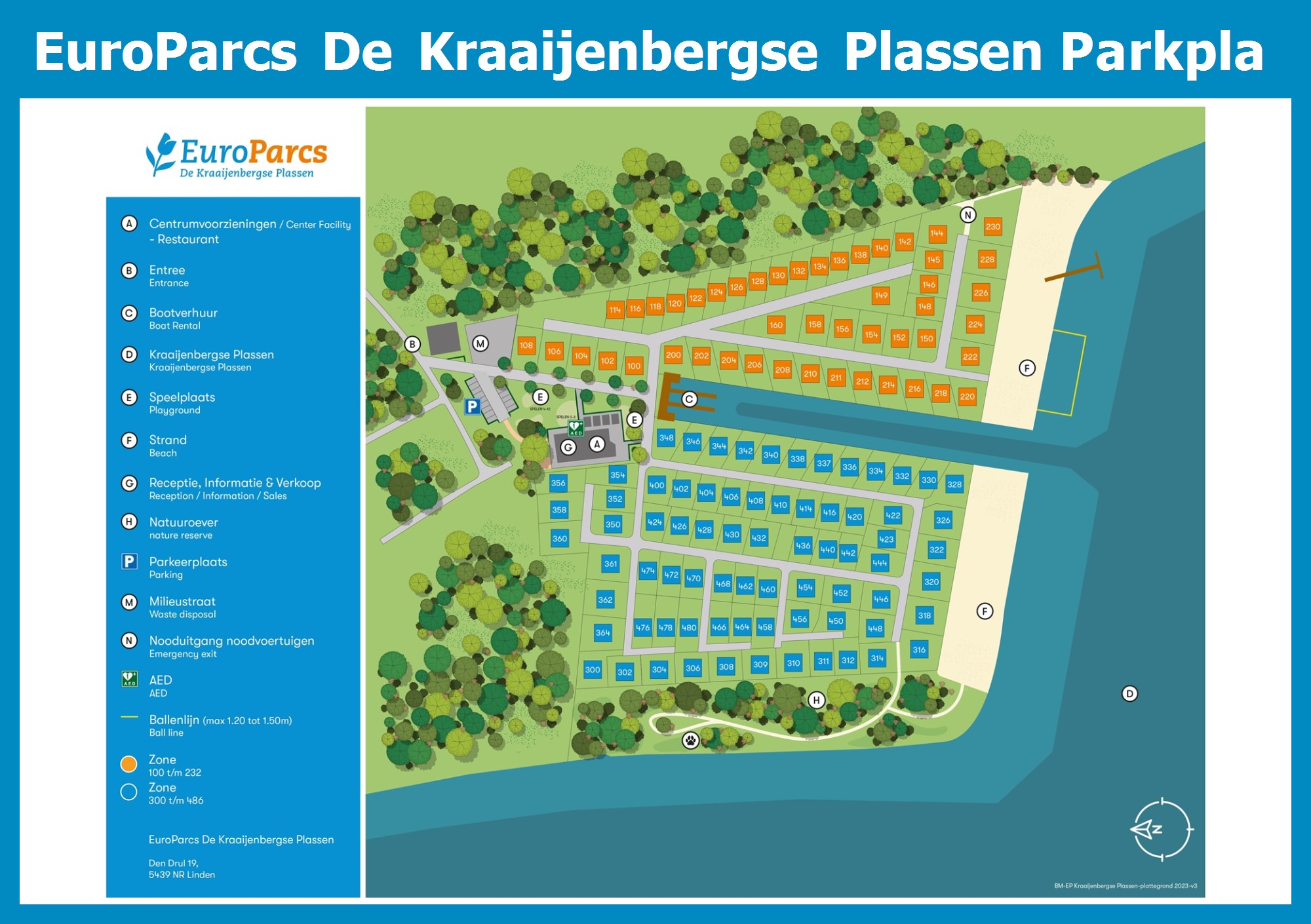 Aktueller und übersichtlicher Parkplan von EuroParcs De Kraaijenbergse Plassen mit alle Unterkünfte und Einrichtungen, auch als PDF herunterladbar.