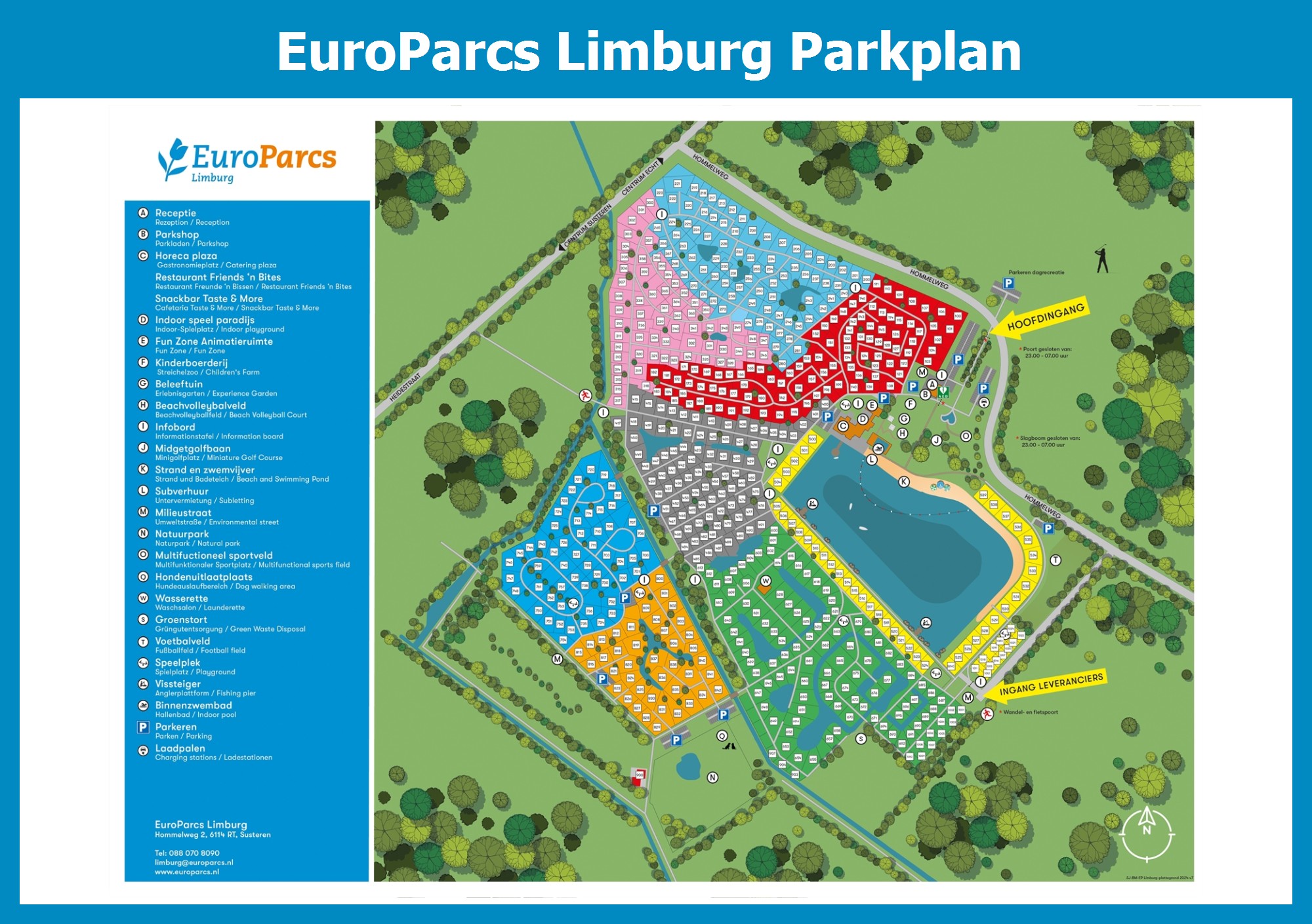 Aktueller und übersichtlicher Parkplan von EuroParcs Limburg mit alle Unterkünfte und Einrichtungen, auch als PDF herunterladbar.