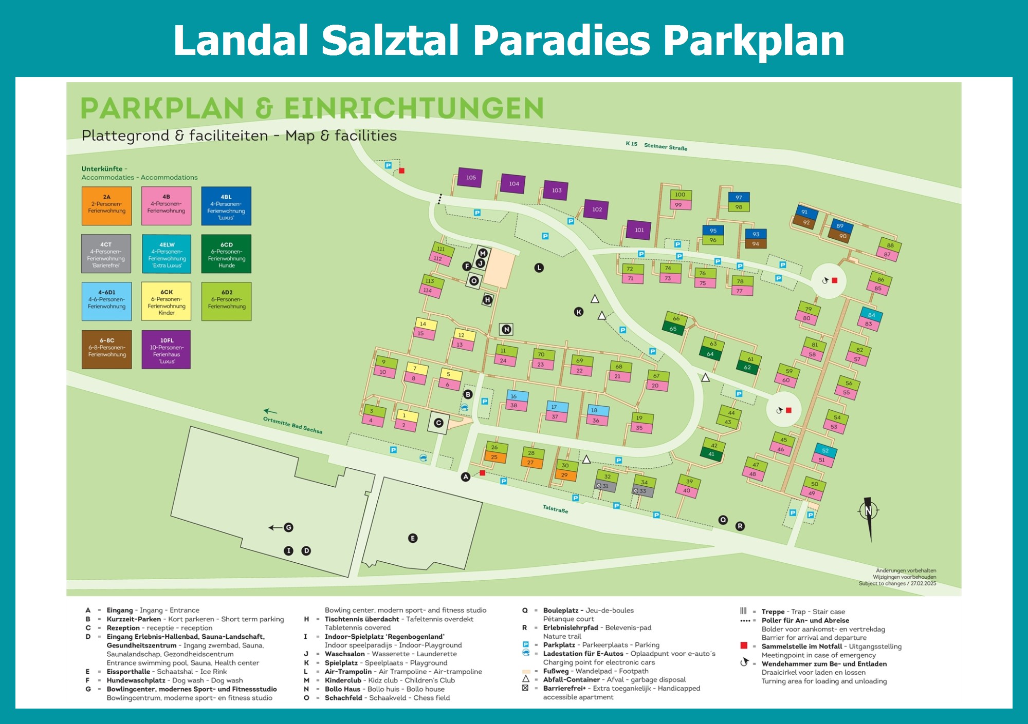 Aktueller und übersichtlicher Parkplan von Landal Salztal Paradies mit alle Unterkünfte und Einrichtungen, auch als PDF herunterladbar.
