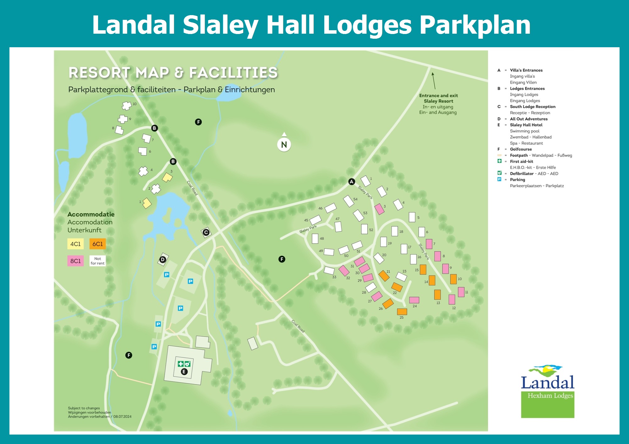Aktueller und übersichtlicher Parkplan von Landal Slaley Hall Lodges mit alle Unterkünfte und Einrichtungen, auch als PDF herunterladbar.