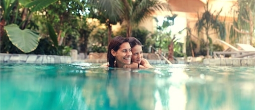 Der Aqua Garden ist wie ein tropischer Fluss angelegt, in dem Sie schwimmen und im 30 Grad warmen Wasser entspannen können. Und wenn Sie möchten, können Sie bis zum Außenbecken mit seinem schönen Blick auf den See schwimmen.